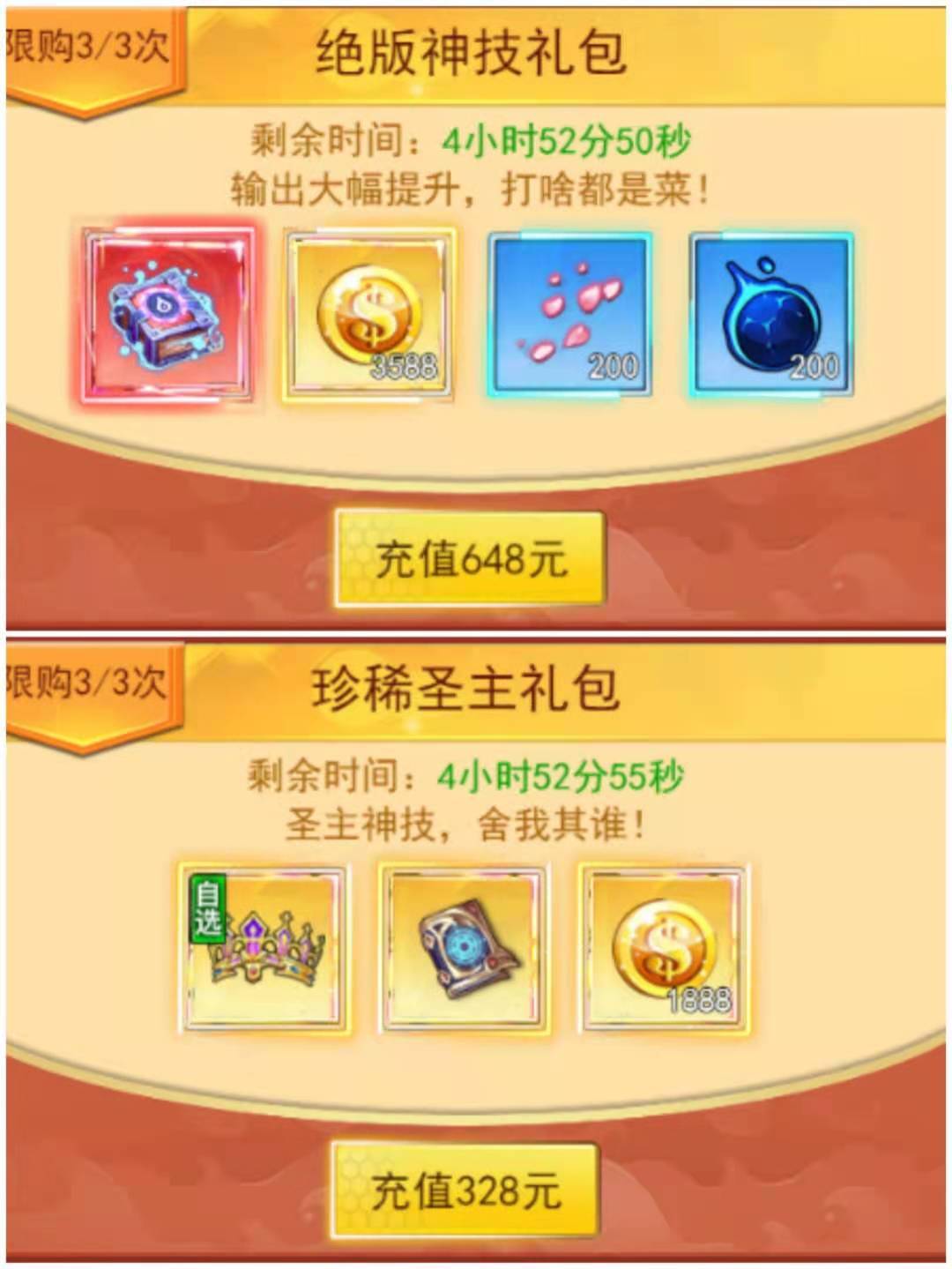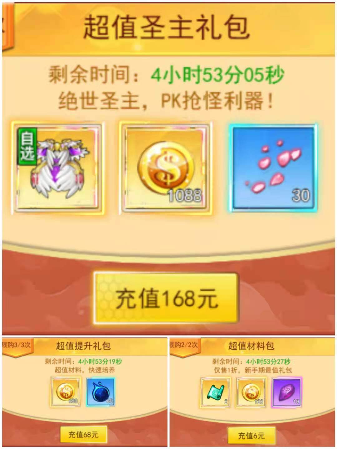 3.168、68、6礼包:(圣主贵重自选:只能选择武器和衣服 神炼晶砂*30 低阶启灵珠*60 仙界秘境卷轴*2 技能铭文*10 金币*1888)