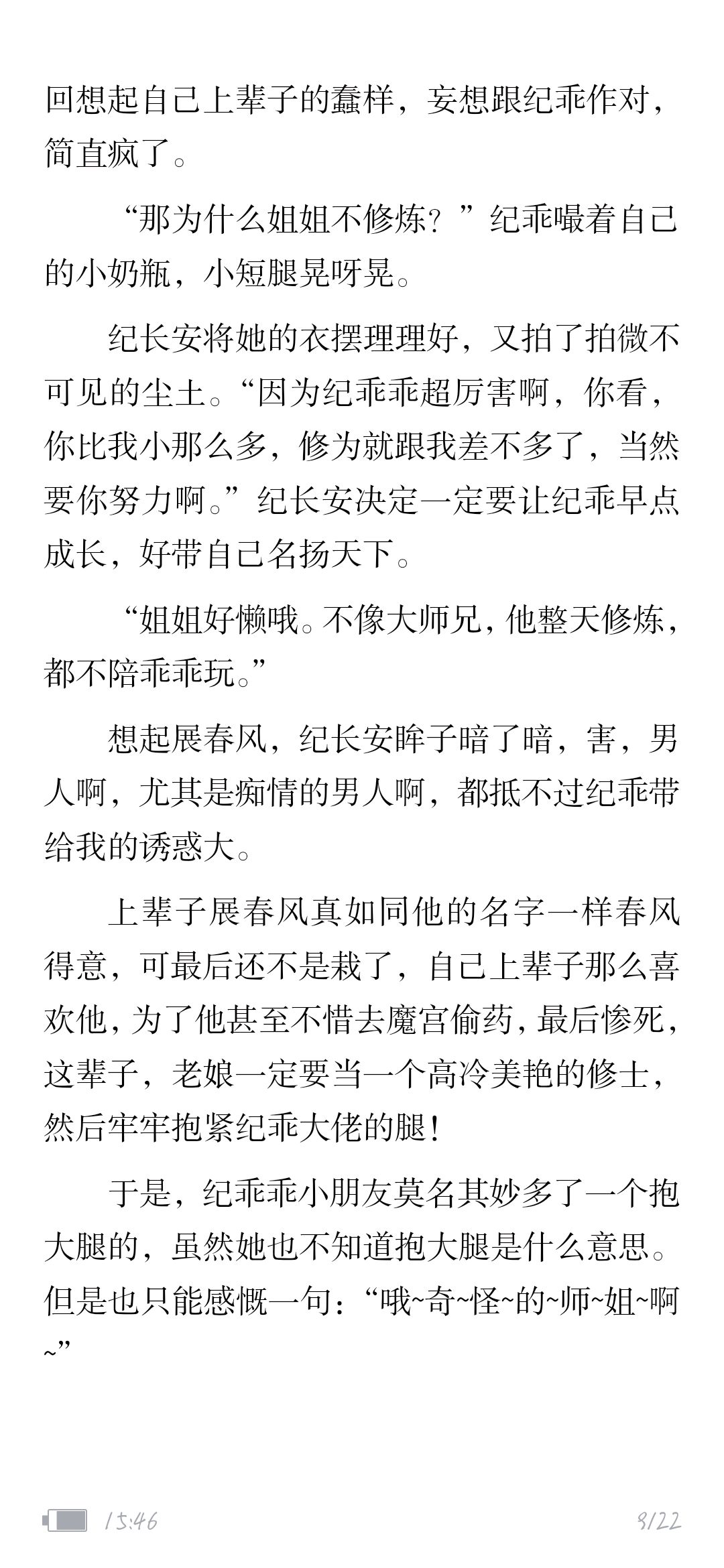 于是,纪乖乖小朋友莫名其妙多了一个抱大腿的,虽然她也不知道抱大腿是什么意思。但是也只能感慨一句:“哦~奇~怪~的~师~姐~啊~”