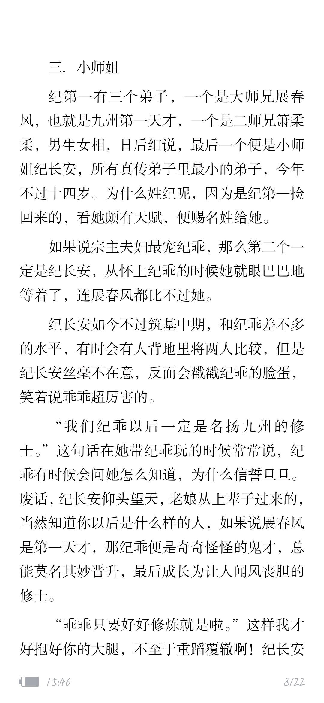 纪第一有三个弟子,一个是大师兄展春风,也就是九州第一天才,一个是二师兄箫柔柔,男生女相,日后细说,最后一个便是小师姐纪长安,所有真传弟子里最小的弟子,今年不过十四岁。为什么姓纪呢,因为是纪第一捡回来的,看她颇有天赋,便赐名姓给她。