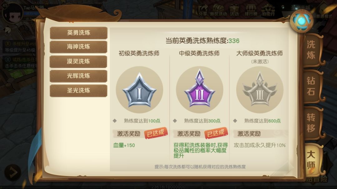 4.多余的装备拿到装备回收处回收掉能换经验和装备碎片,是经验的另一个主要来源。装备碎片用来升级装备部位的等级,建议前期升到4-5级就可以了。其余的全换洗练石,去装备洗练处刷熟练度,熟练度高了有各种属性和buff加成。洗属性选紫装或金装(每5石头随机增加1-5点熟练度)刷熟练洗白装(每一石头固定增加一点)。紫装以上,洗出的属性可以花金币转移