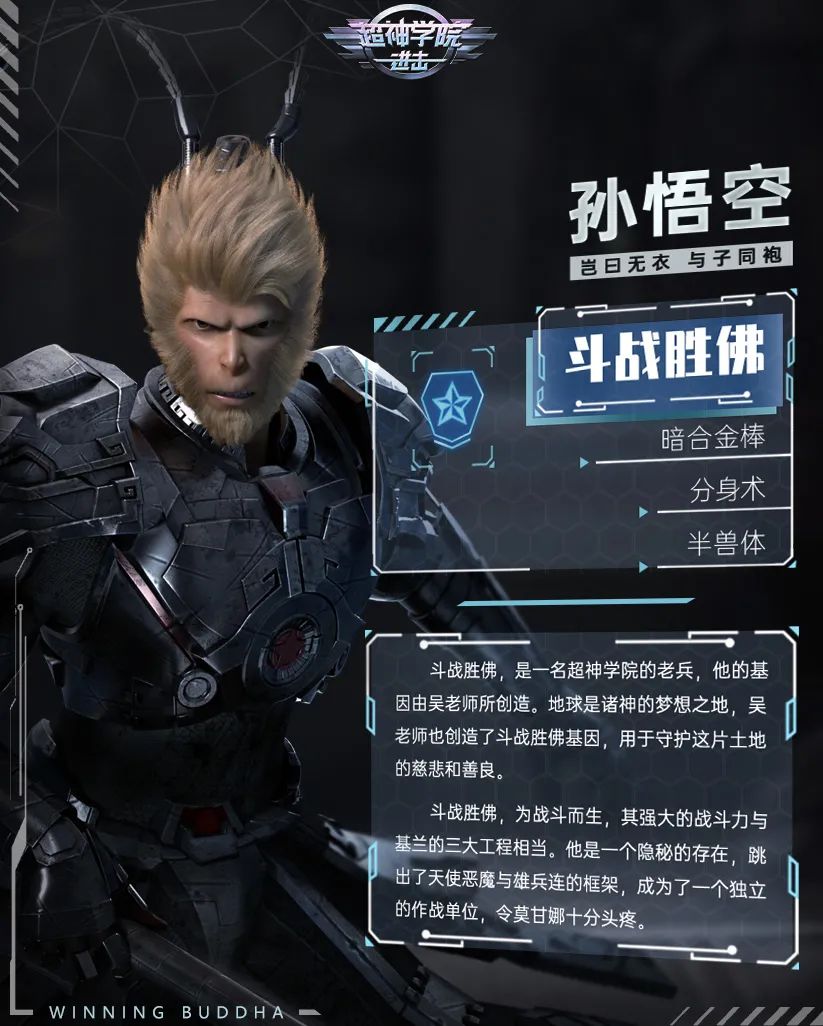 斗战胜佛,是一名超神学院的老兵,他的基因由吴老师所创造。地球是诸神的梦想之地,吴老师也创造了斗战胜佛基因,守护这片土地的善良与慈悲。