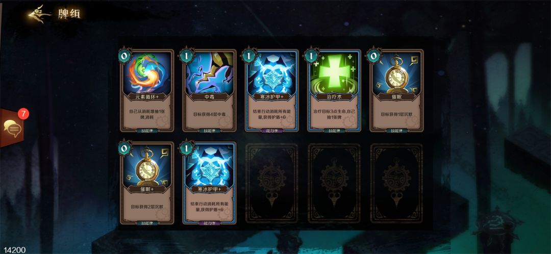 有了两张寒冰护盾,紫罗兰套装,元素循环之后。还需要获得一张沉默。防止第二大关boss使用加攻击的技能卡。