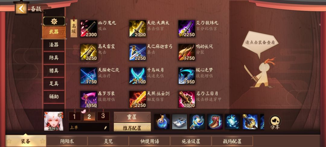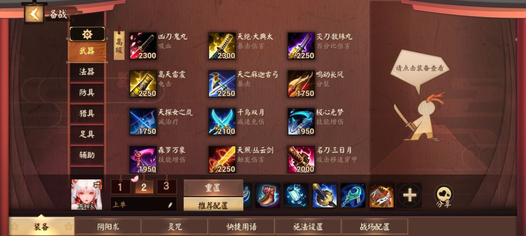 选用的是开局七面的续航流打法,鞋子的选择视情况而定,对面坦度较高时,选取法穿鞋,物伤较高时,选取护甲鞋,法伤较多时(如p2那场),则选取法抗鞋。出吸血刀和天沼提供追击与续航能力,后期鞋格子腾出来后,有两种选择———1.对面坦度较高,选取山吹花烬;2.对面输出较高,选取大镜子(提升续航)/神意(提高伤害)。