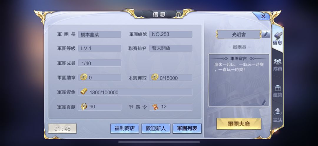 新建的軍團,不強制參加活動,一起玩開心就行,歡迎加入,軍團搜索 光明會