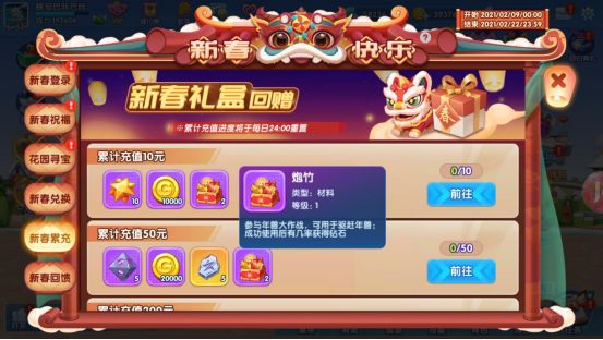 完成指定任务即可领取“炮竹”,根据任务不同给予“炮竹”数量不同,每日5点刷新。
