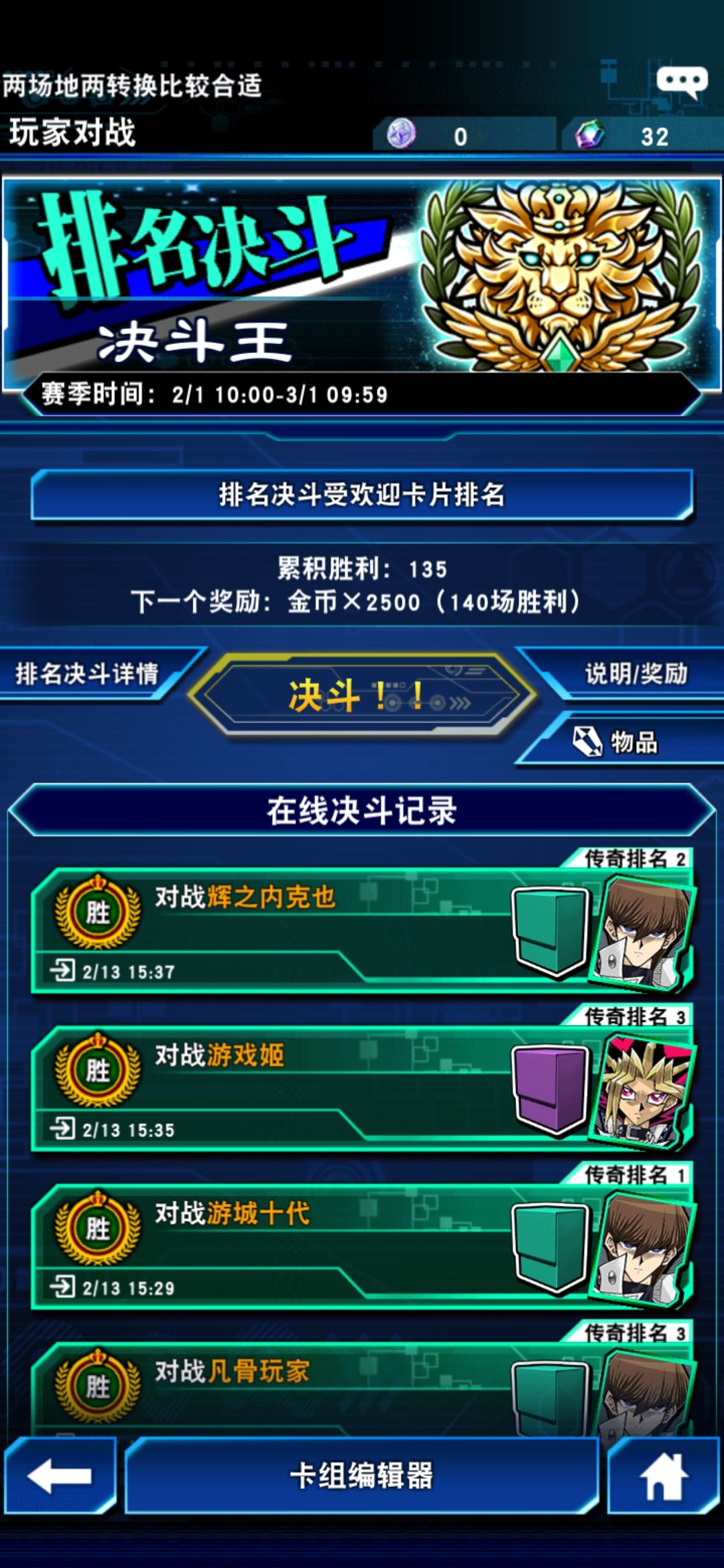楼主是比较咸鱼的玩家,啰里八嗦的赢了135场才上王