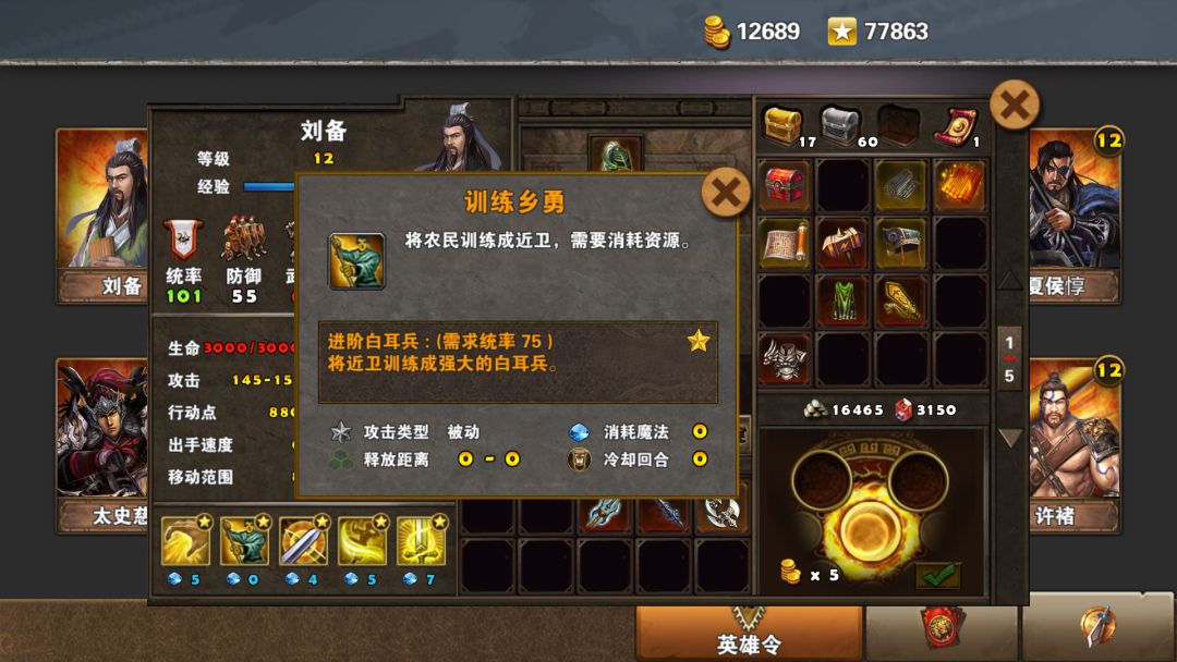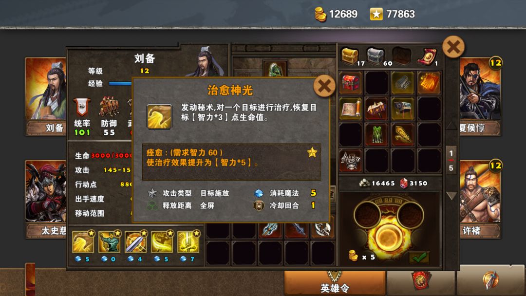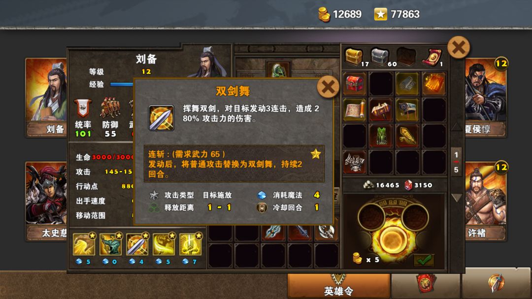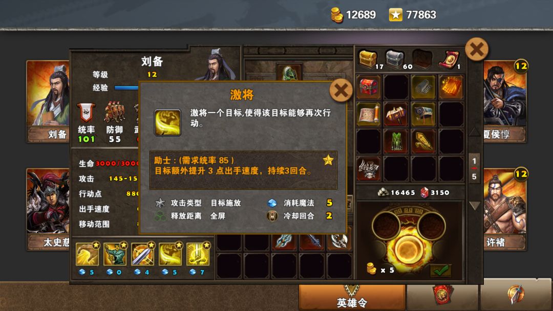 刘备招牌技能之一,给全军提供伤害,并可以不损耗行动力。