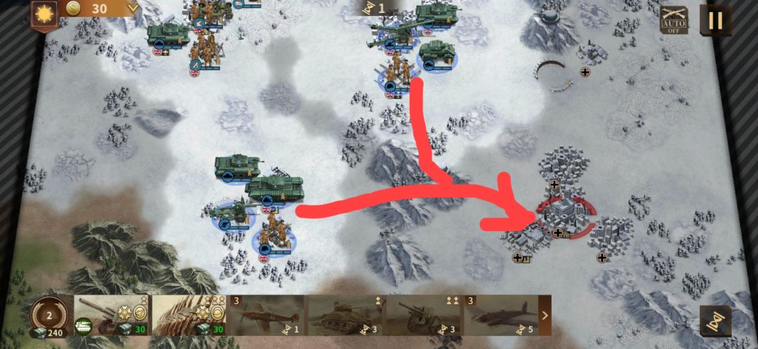 如上,占领左下角城市后,全军平推至最后一个红圈城市,胜利。
