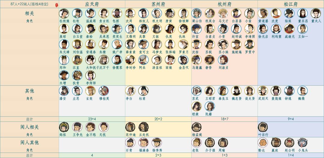 目前游戏中87居民,10闲人居民,12客栈闲人居民。