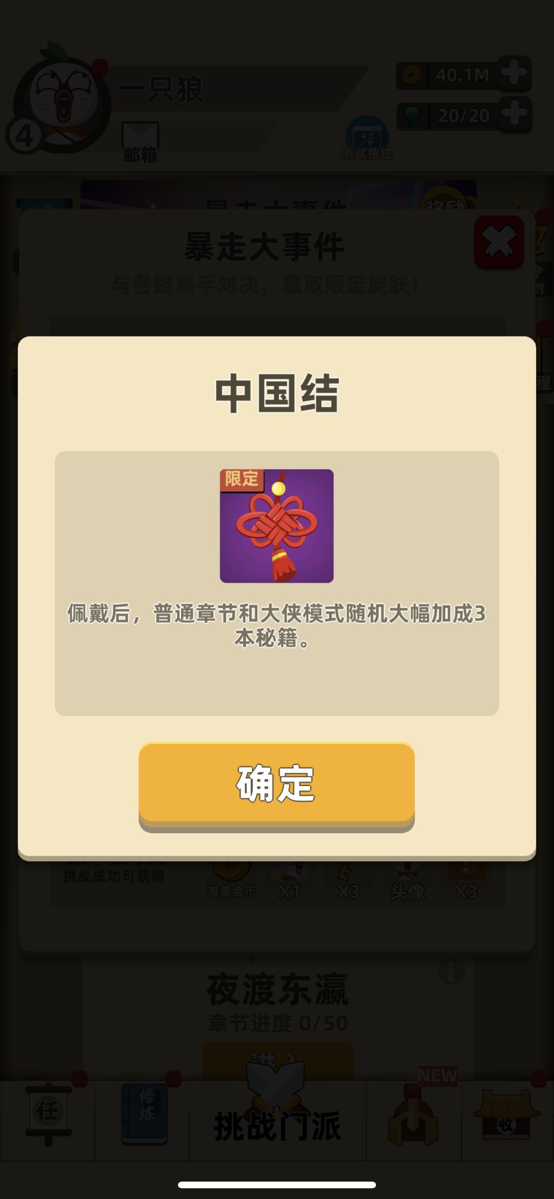 击败唐马儒,掉了个红红的大宝贝,能大幅加成我阿宅的功夫实力,好东西啊!