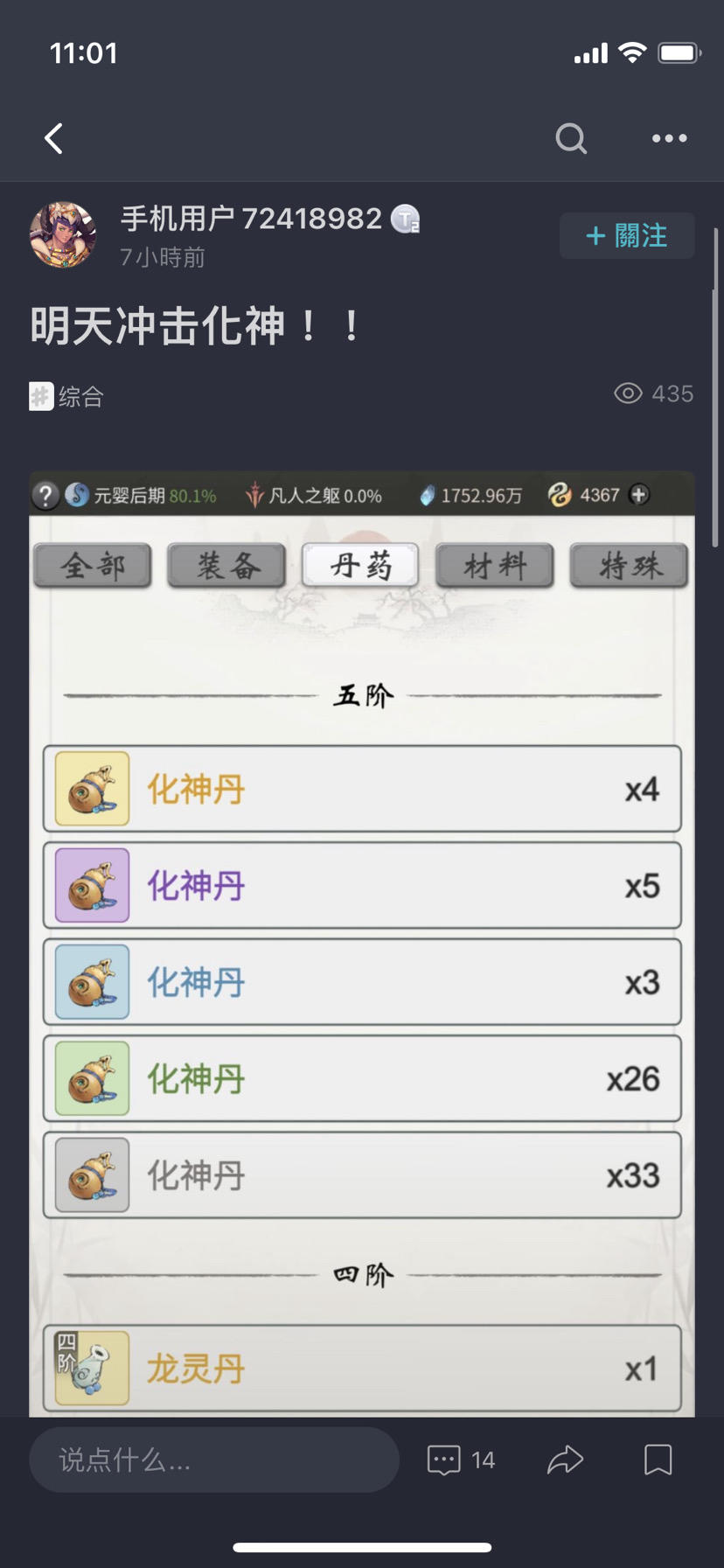 明天就要化神了,这么久妈的一个橙的都没有,紫的也只炼了俩,明天要是不成真要哭了...