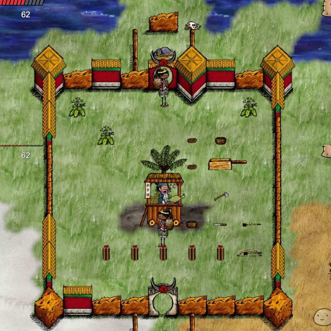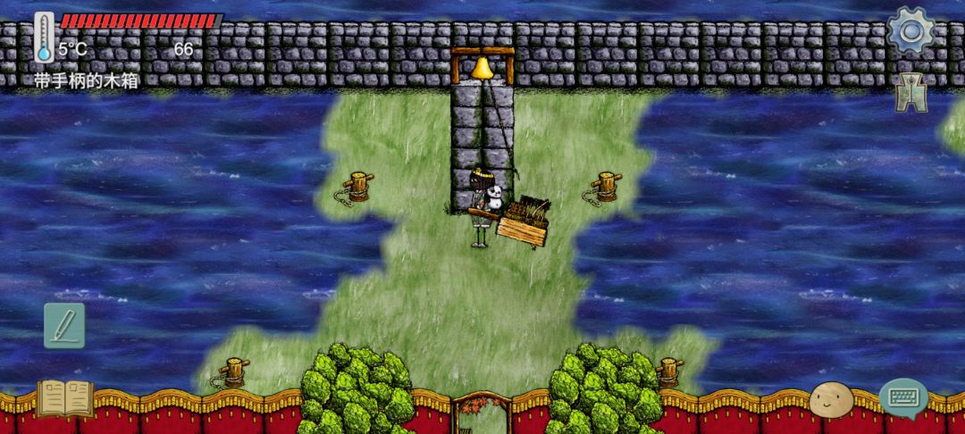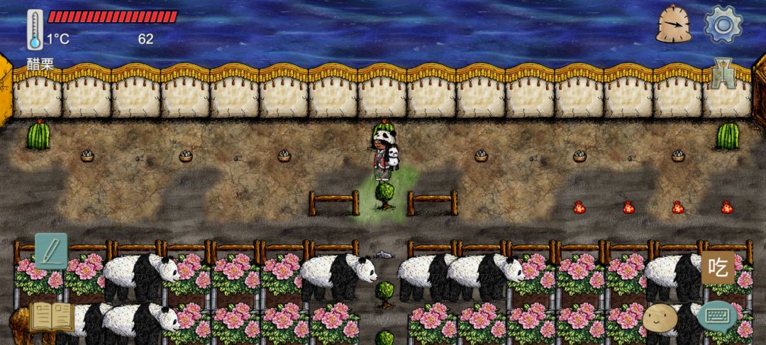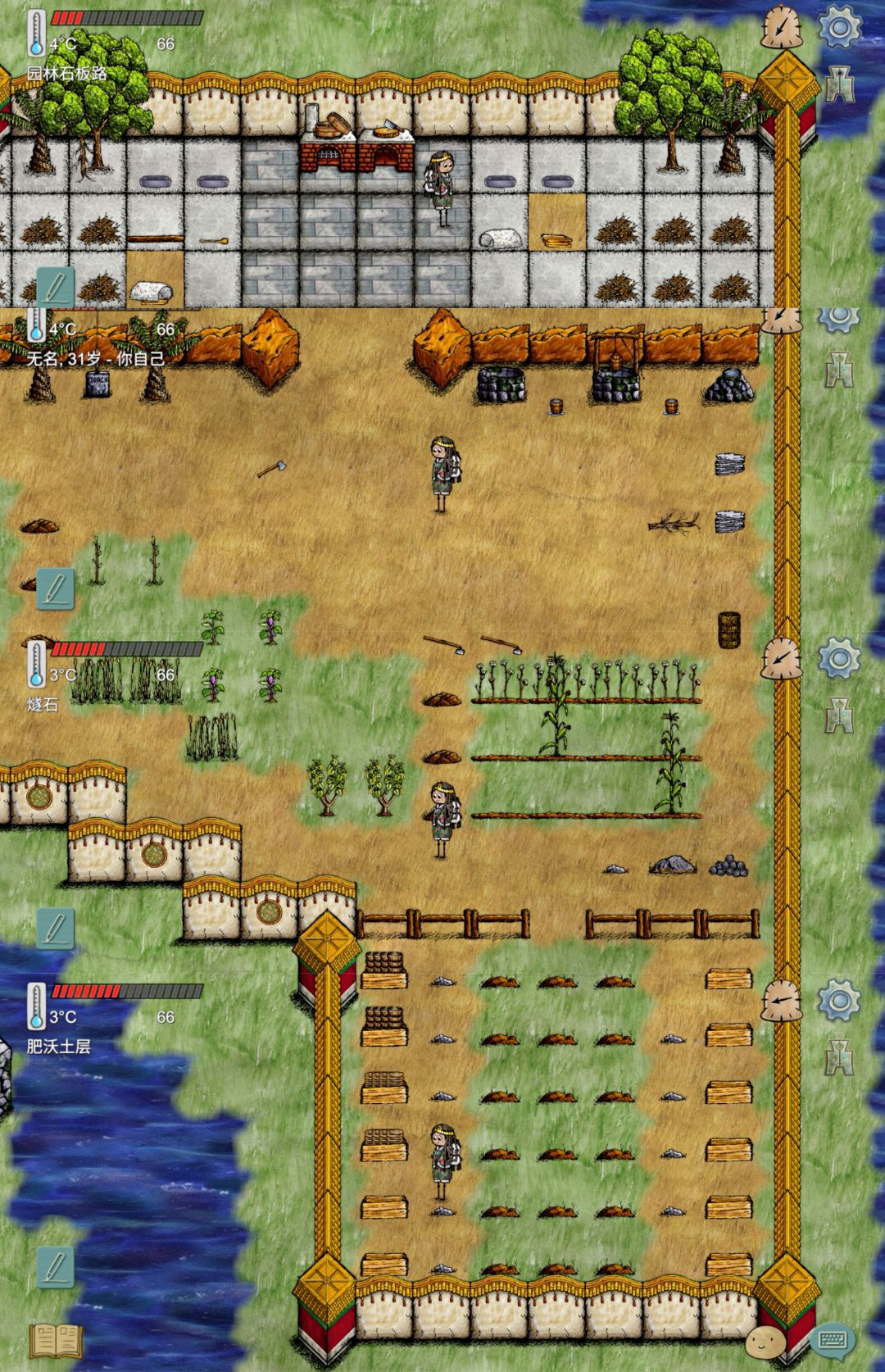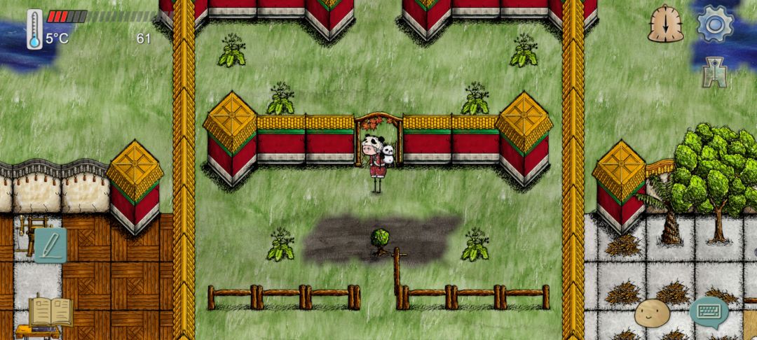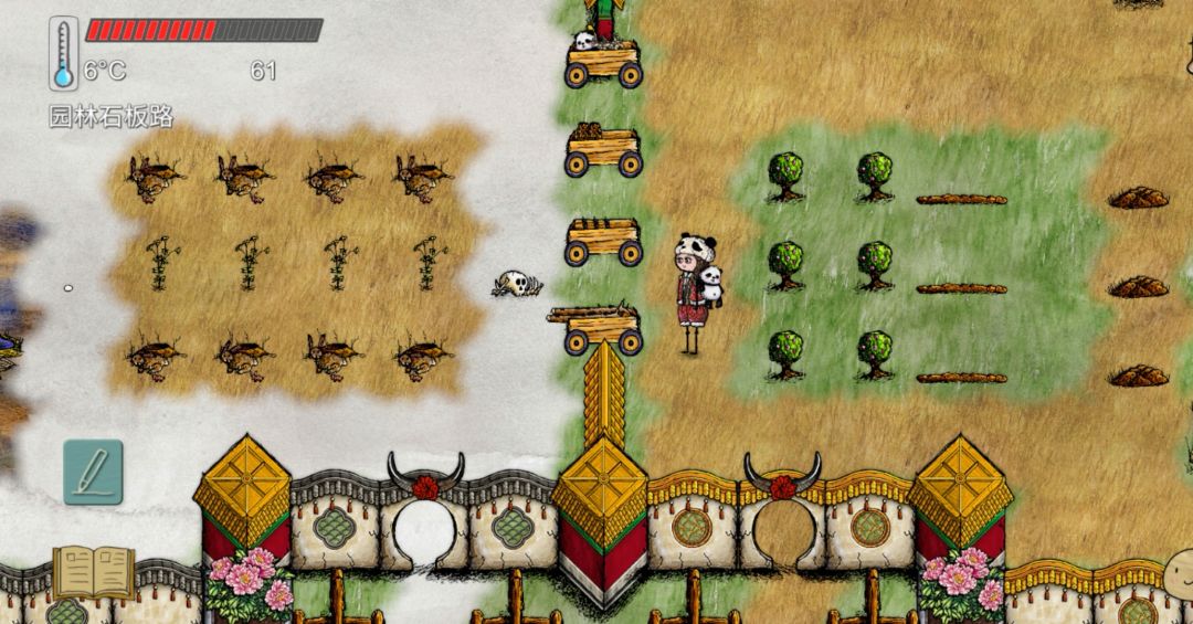 右侧黄色瓦墙里,从北向南依次是厨房、田地和泥土区。这应该是黄族的地盘。未完成的墙浇完水可以获得土坯用来建烤炉榨油烤派。各种作物都要多种点,最好都留个种,别全都嚯嚯了。最少最少需要做3把箭2把弓,其中一弓一箭用于打通与白族之间的快捷通道,一弓两箭是杀年兽必备。当然最好能再多做些。土堆区的箱子加根长直木棍就可以拖着到处跑了,大量携带物资必备。