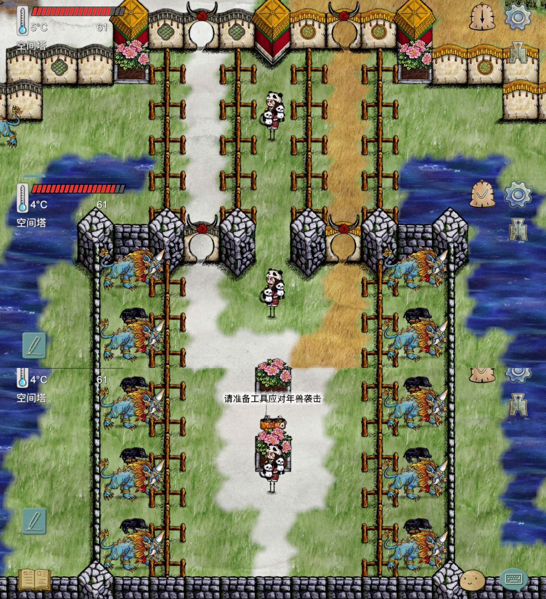 在牡丹花丛前睁开眼睛,列队站着的两排野猪和青色野兽正盯着我看,尖锐的牙齿和巨大的尖角闪着血光。你,你们要干什么?我定了定神,发现它们都被关在栅栏里出不来,太好了。广播器不知疲倦地重复着一句话“请准备工具应对年兽袭击”。这就是年兽吗?也是之前牛牛村村长说的青兽吧。我们,就是要从这群凶兽手里解救牛牛村吗?突然感受到了一点点压力,莫名地兴奋起来。我,我这就去做准备。我们要以最少的损伤保卫牛牛村!!!快步向北边门里跑去,回头正对上年兽那铜铃似的眼睛,我不怕你!!!