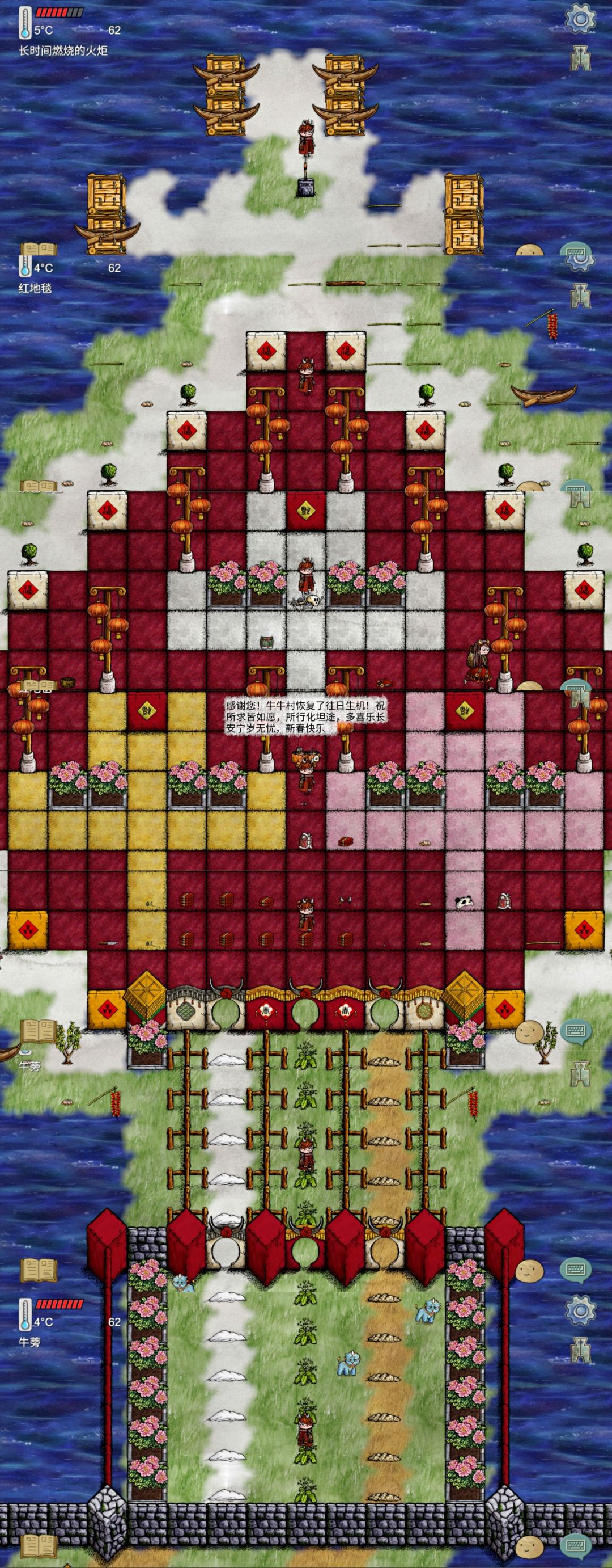 牛牛村为我们准备了喜庆的衣服,我们洗去一身污渍,穿着新衣服热热闹闹开红包、放鞭炮、吃饺子。我们划着小船去西南方听音乐,去西北相思树下许愿祭奠英灵,去东北看曼陀罗花,去东南方向抱大兔子。南边的院子里还有些小年兽,小小一只可可爱爱,完全看不出长大后那凶恶的样子。