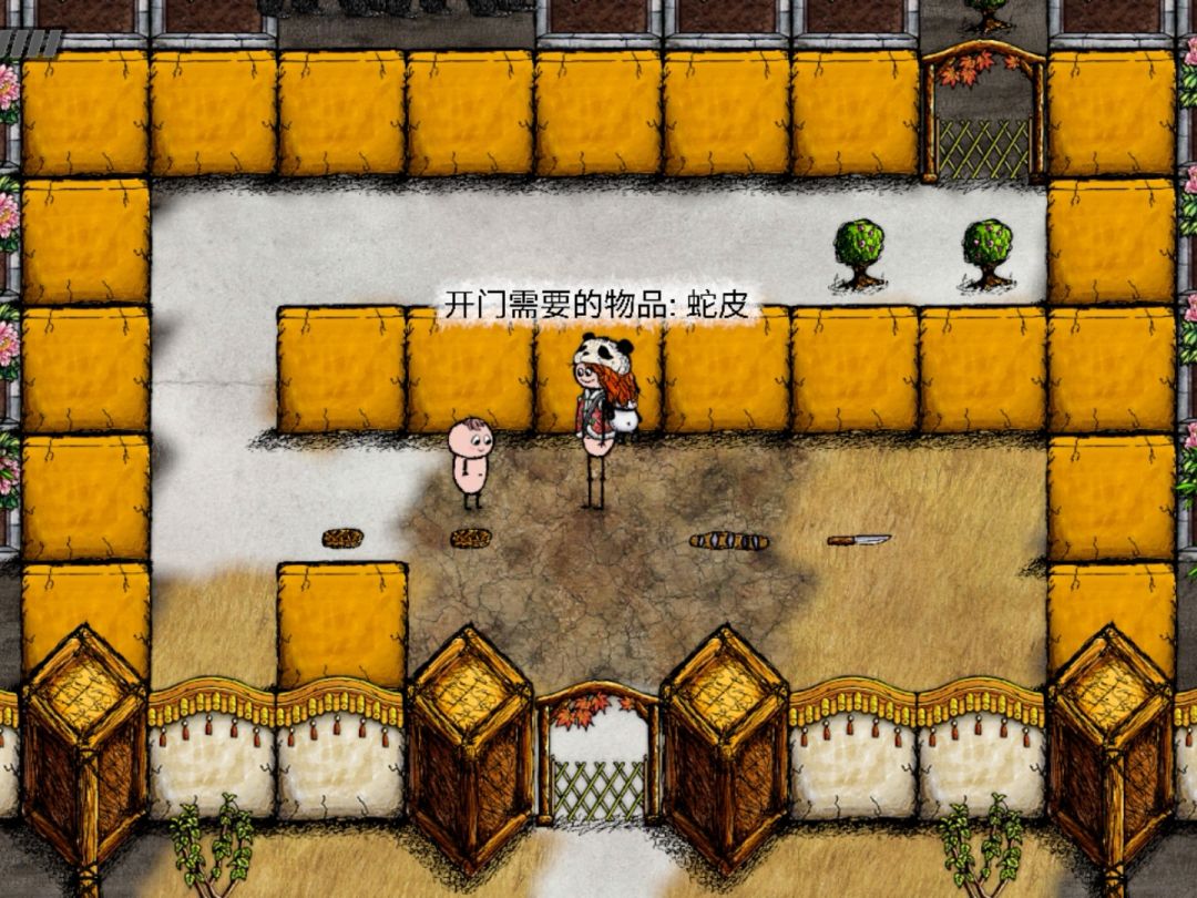 穿过熊山熊海,拿路费进了黄色的奇怪建筑,捡起地上的刀干掉沙漠地形上的蛇,剥下蛇皮就可以出门啦,当然刀要揣走后面关卡可以用。