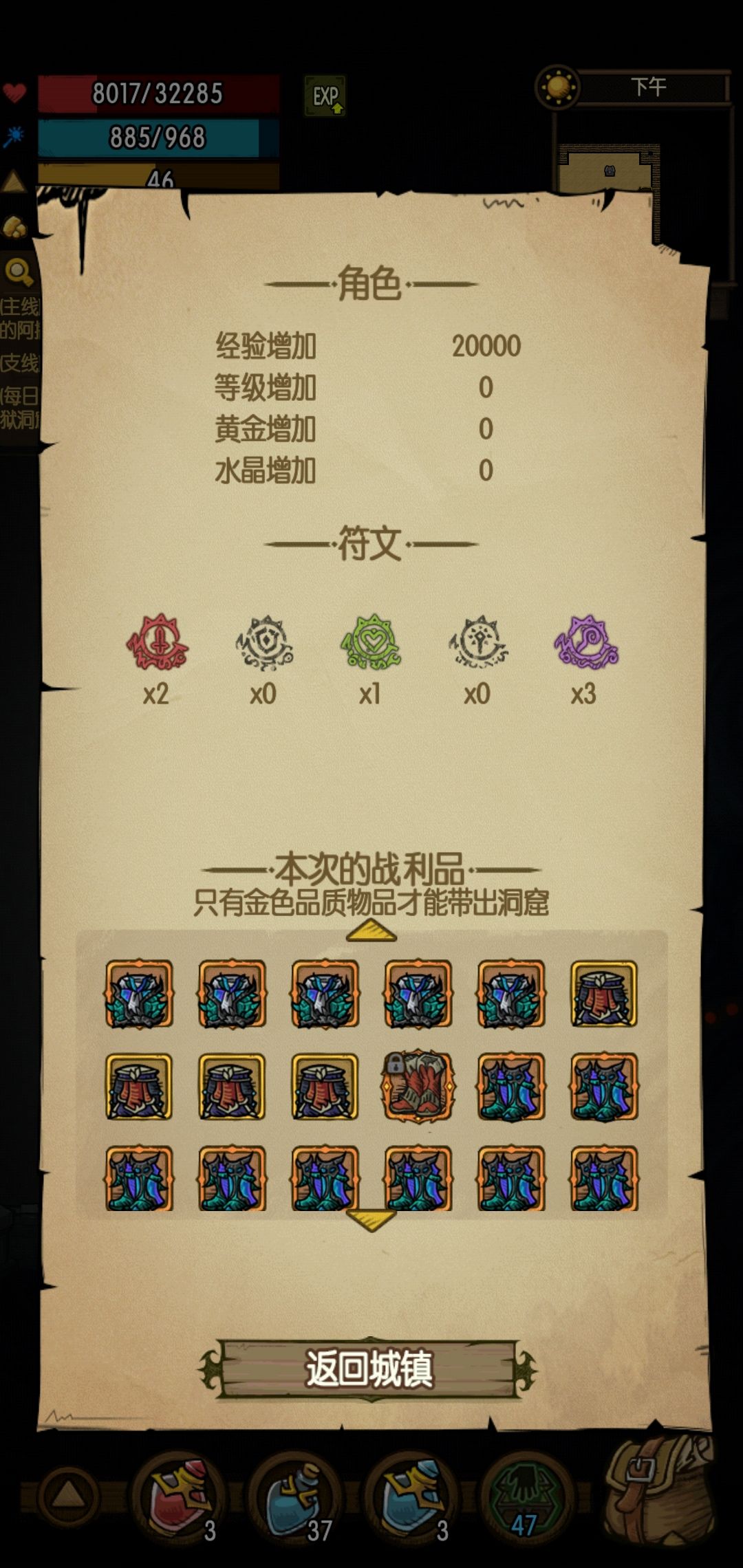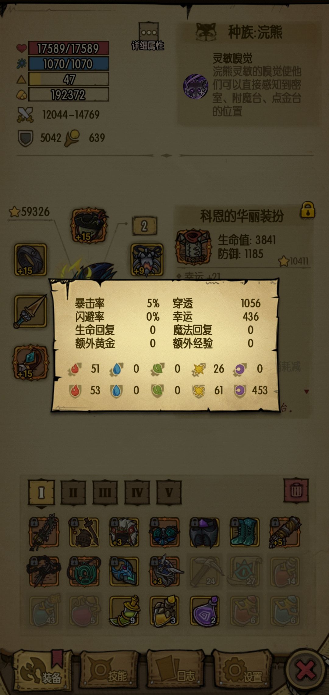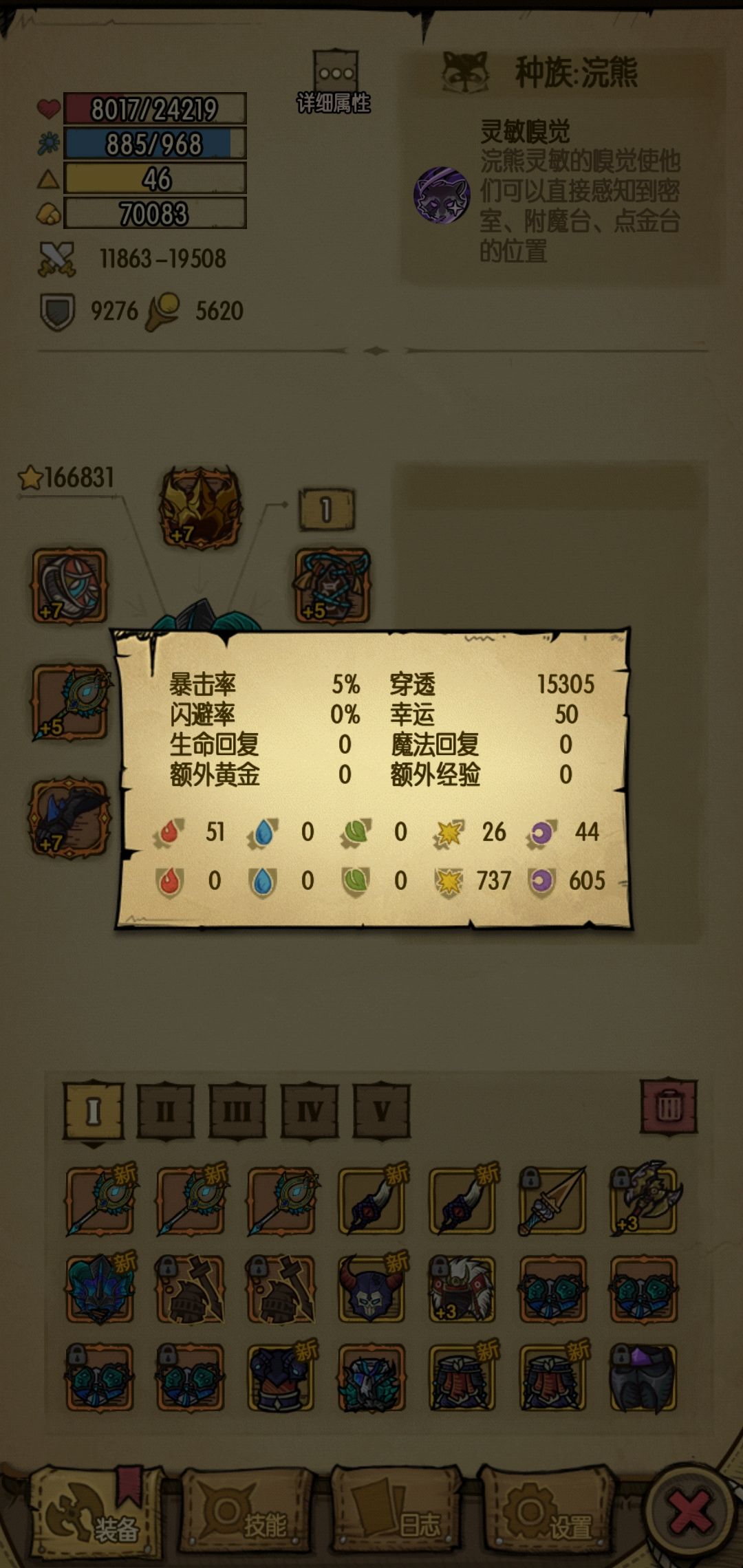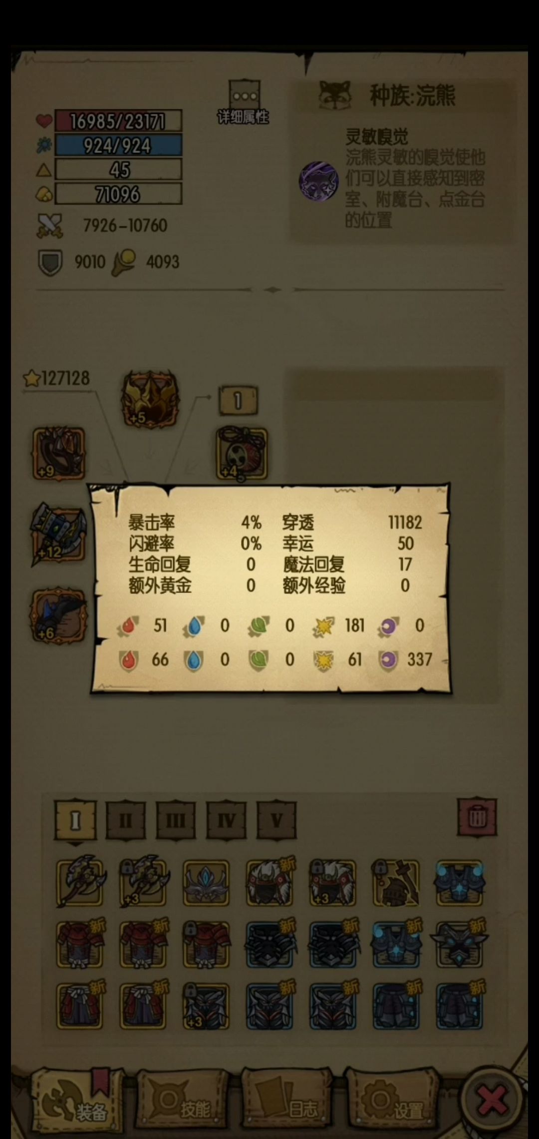 通关面板:没截图,和打元素相比武器换成改造成魔力+穿透的圣兽之牙(如果有遗忘剃刀更好),戒指换成改造后的英灵戒,项链换成改造的暗金项链(刷出来恰好有个穿透词条,我就拿来改造用了),身上五件还是裂缝24刷的那些