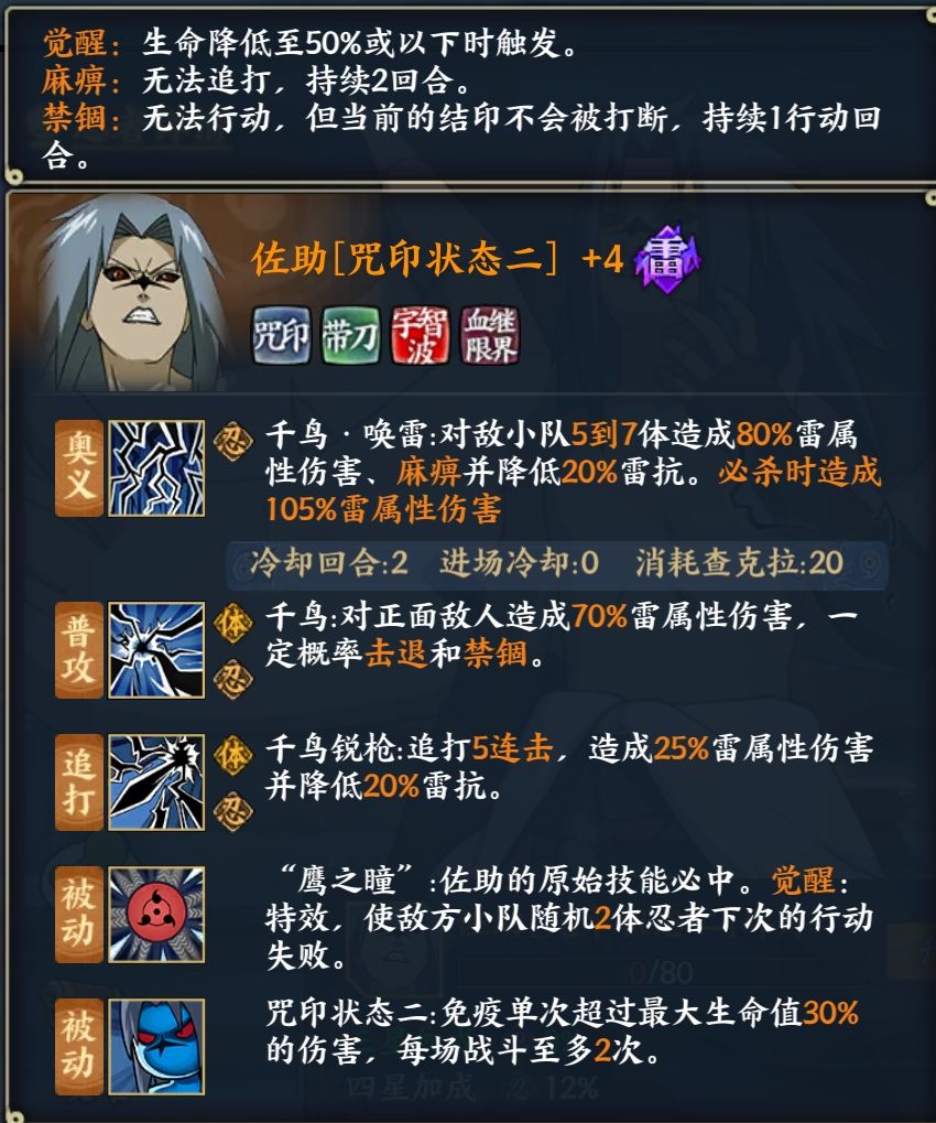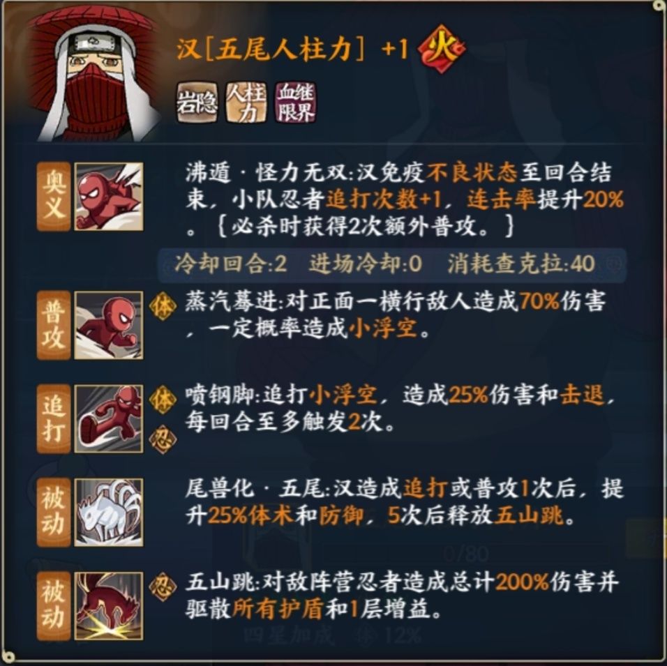 曾经的九尾入侵MVP,改版跌落神坛,目前版本唯一一个s级可以降低属性抗性的忍者,因为觉醒过于强力被削过一次,pvp强度直逼仙鸣之前版本的ss忍者,所有普攻和技能必中,奥义和追打无限降低雷抗,血量低于50%觉醒敌方下次行动失败,免疫2次伤害高于自身30%血量的伤害,让他能抗能打,但是害怕集火,维持血量健康是关键,九尾入侵中依靠汉增加追打次数能越打越疼,不过随着九尾的改版,用处大不如前。