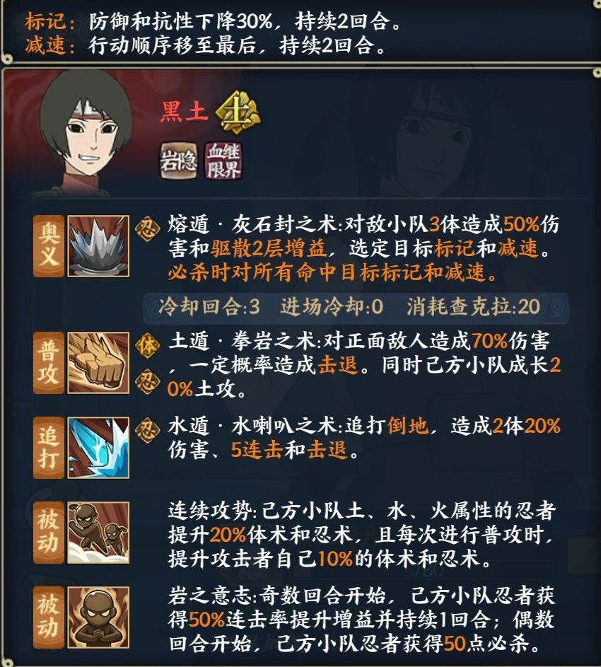 优秀的养成机制不止搭配土影老頭,搭配其他火水土忍者也有奇效,目前必备打狼和副本活动攻坚忍者之一,养成恐怖部分情况程度甚至比汉更强。