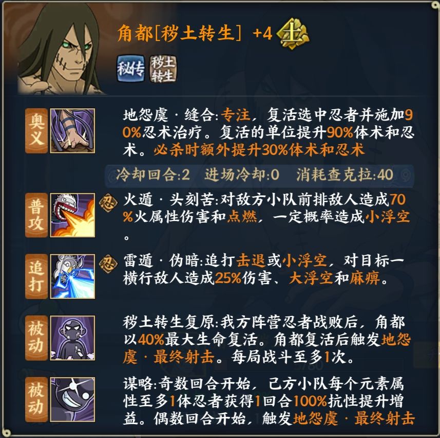带专注的复活奥义,复活后提升体忍,优秀的复活机制,被动加防破闪降防,使角都秽土辅助强度直逼ss忍者,到手不亏