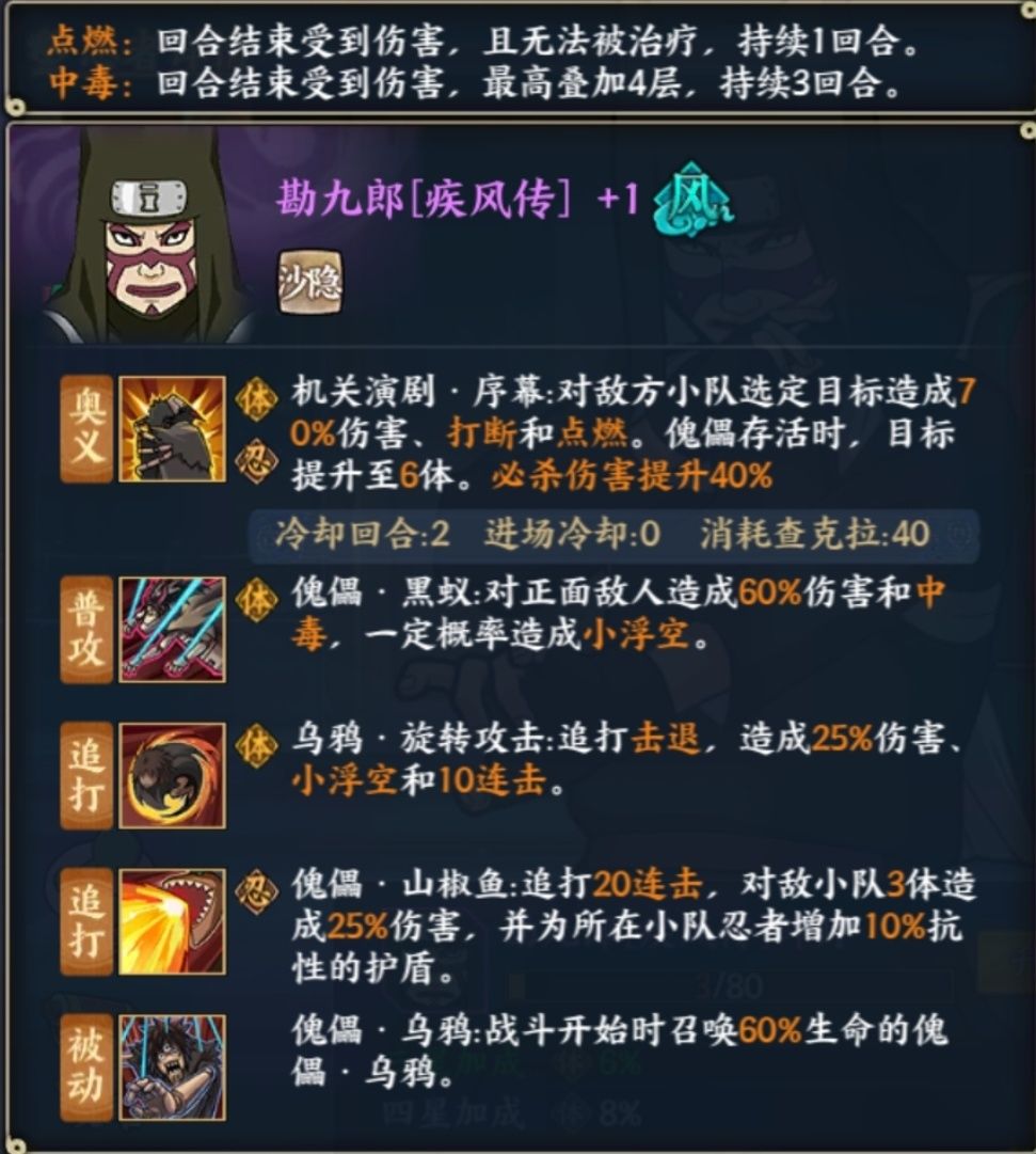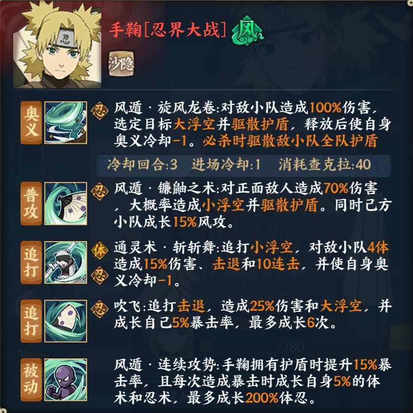新版本打猫用忍者,其它场合出场率不高,实际上如果能得到适当的开发在高战忍战中能占领不俗的地位,良好的风攻养成和奥义消盾效果极端克制新土风火影队