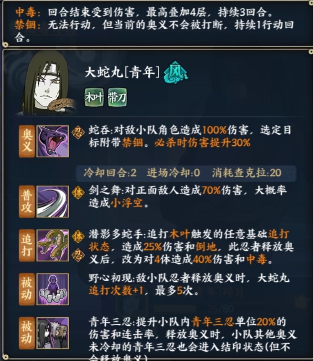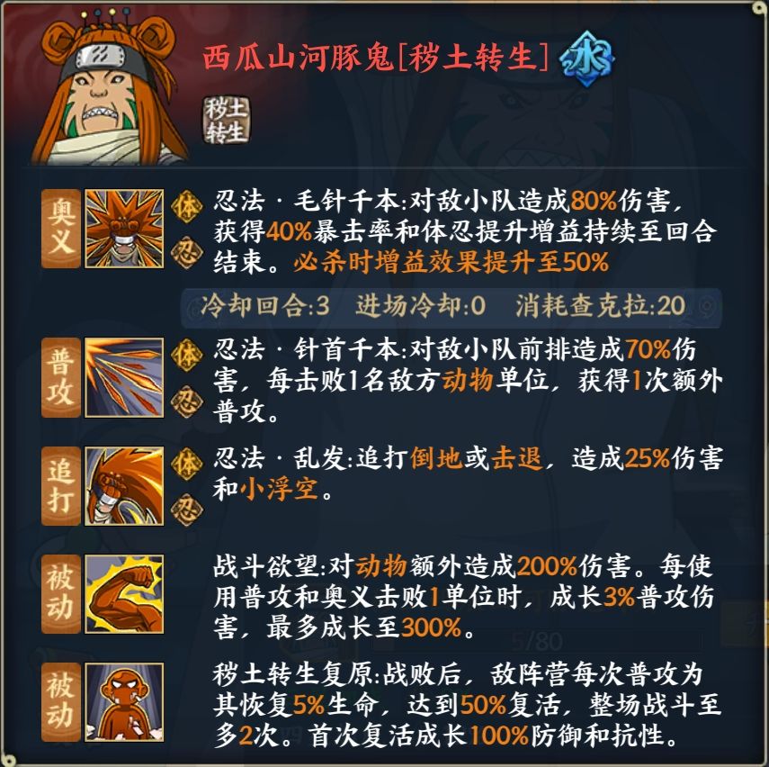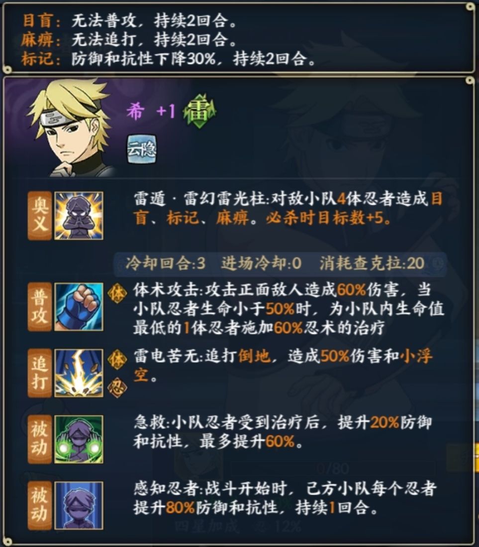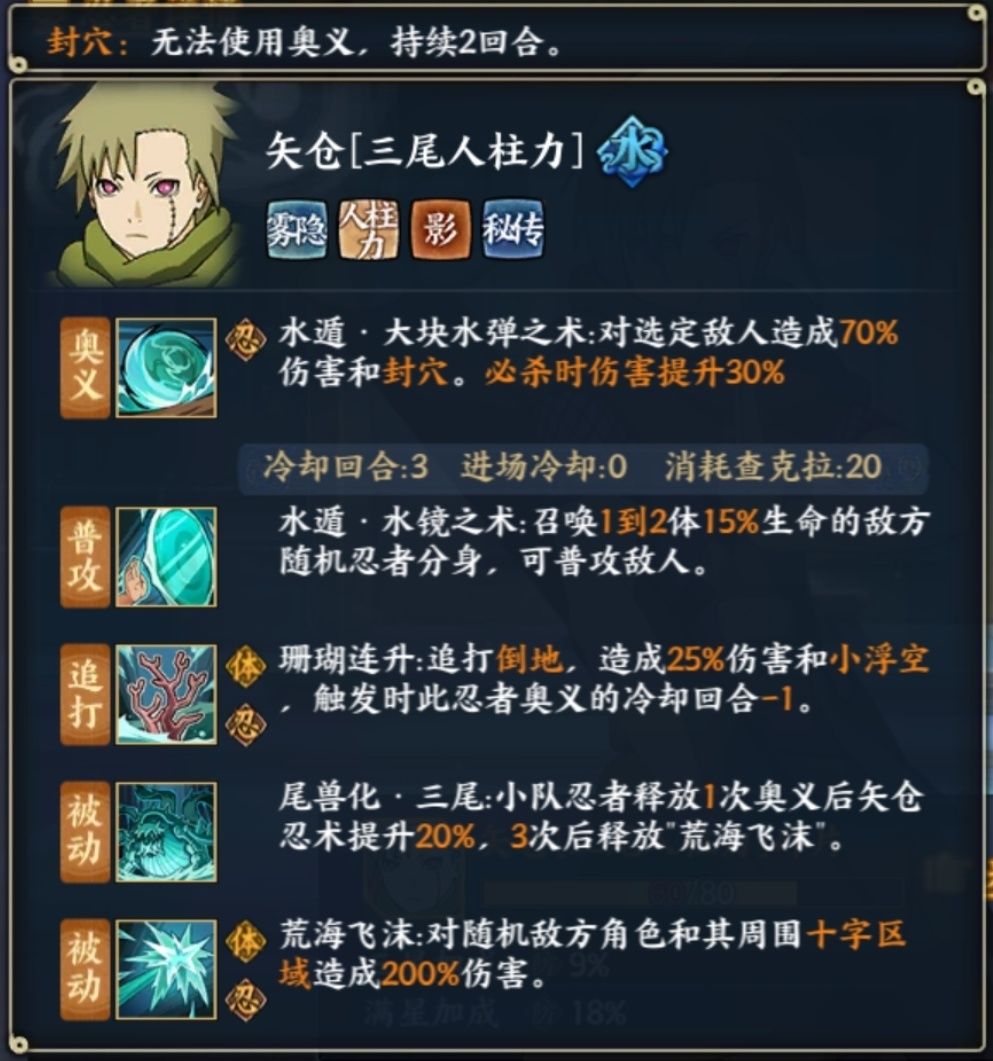 矢仓(三尾):普攻随机召唤1-2体敌方分身增加保命和意外输出能力,进场冷却0的单体封穴控制,追打减少冷却的机制,使矢仓的冷却在合理搭配汉的情况下如果每回合都能追打,可以保证每回合都能使用奥义,我方累积释放三次奥义后的十字型200%体忍伤害尾兽炮爆炸输出,使矢仓在部分忍考和高难活动中有着绝对的输出打断位置,pvp在没有解控的情况下非常脆弱,反之会让敌方清楚的感受到何为恐惧,非常强力。