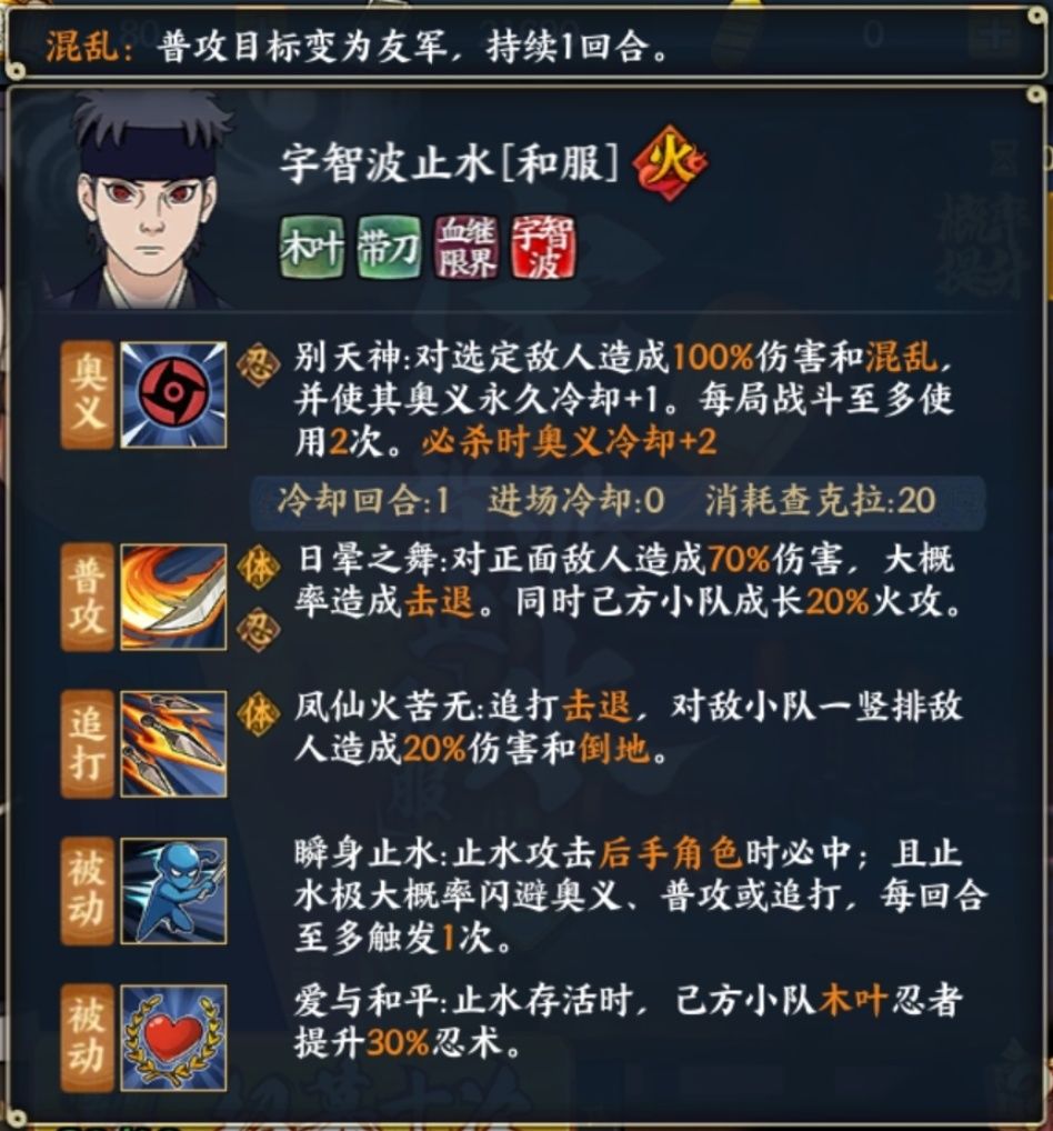 现版本唯一具有“先手必中”这一被动和大概率闪避的s忍,而且技能无cd,普攻高连击,面对诸如青年水门这种起手高普攻次数或者晓鼬、水影这种自带突袭普攻连击恶心的忍者可以说非常强力,就是奥义次数每局最多只能用两次,可以说是十分戏剧性了,止水你是把眼睛抠下来扔对方脸上放的别天神吗?(笑),在远征这类难度高回合少的场合非常实用,因为普攻有加火攻的特性,pvp除了用来克制强忍外也经常被用来养成须鼬秽土迪这类高爆发火属性忍者。
