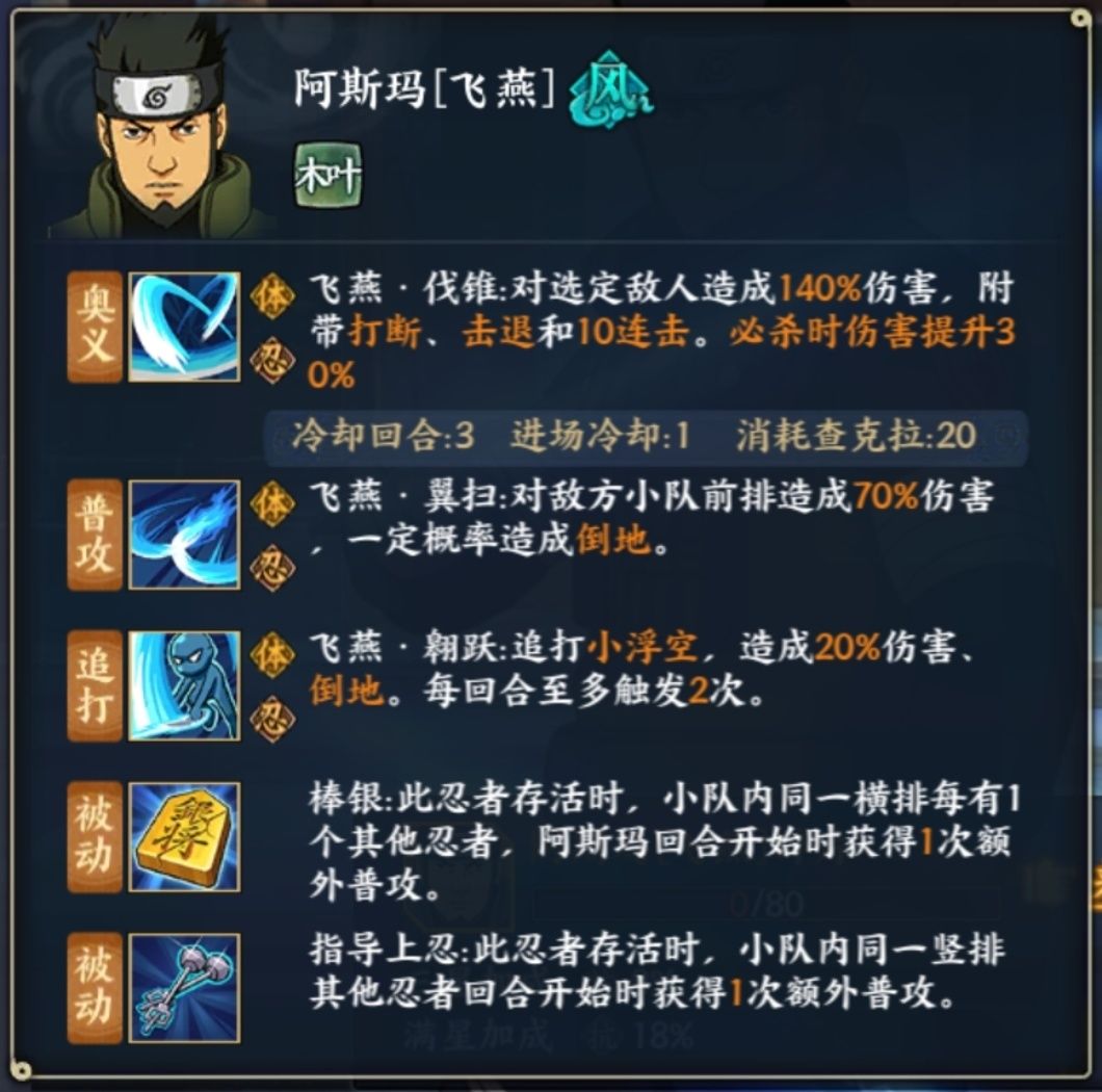 阿斯玛(飞燕):曾经极强也是除土主唯一的的普攻增益忍者,随着版本没落,但是在部分忍考和有回合要求的活动中依然强势,可以辅助汉,矢仓和天道畜牲道等等,pvp经常碰瓷儿自家青水,起手吃了混乱的青水经常3个螺旋丸下去活活搓死飞燕(笑死),pvp慎用。