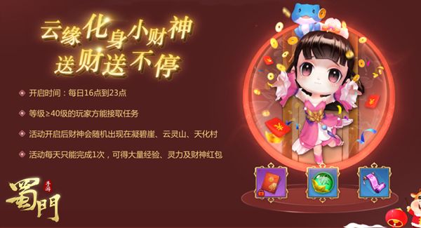 正月初五财神到,迎财接福好运兆。《蜀门手游》祝愿广大蜀友们四方财运笼罩,天天富贵乐逍遥。活动期间,NPC小财神将在蜀门大地随机巡游,每个整点刷新位置,玩家找到并与之对话,海量经验灵力以及财神大红包即可便领,其中打开财神大礼包可获得随机数量的绑银,还有机会开出全新珍稀道具“洪福齐天”!