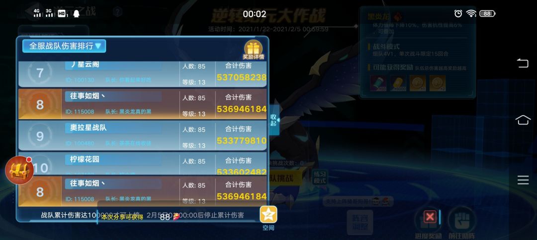 往事如烟新晋13级战队,上次战队赛上过前10,战队主战队赛,这次战队赛第一天成绩如下图,有战队欢迎战队群活跃和打战队赛的大佬,有意者请进下方审核群,欢迎各位大佬到来(战力要求神宠榜过50W)