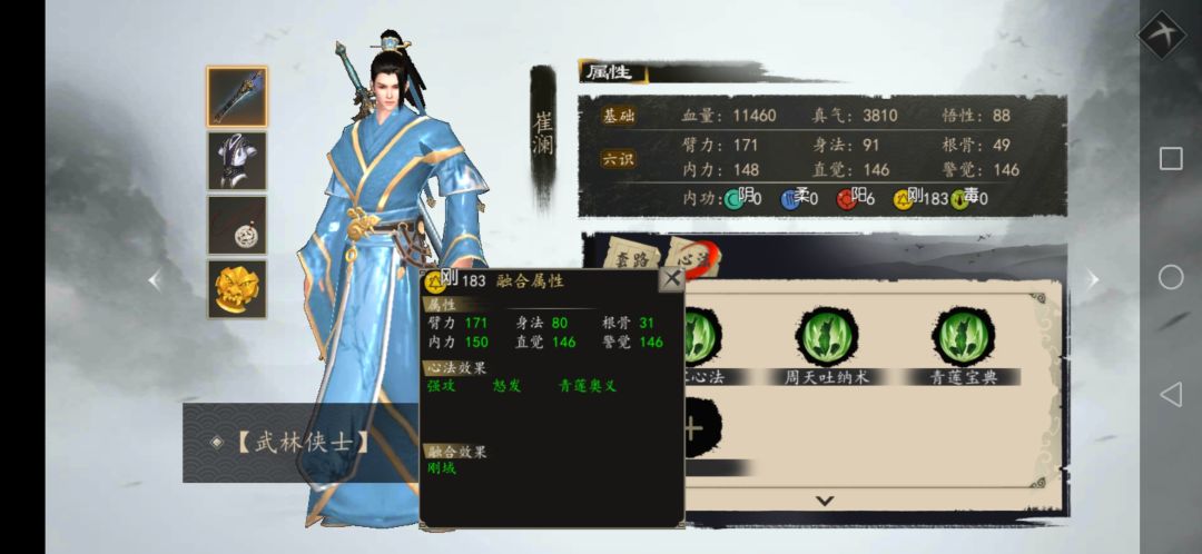实力:四维也可以,身法低了一点但是没关系,因为这里有个心法特性“武道”,侠客里唯一一位拥有武道的。武道是什么请大家自己去游戏里体验一下,我这里不剧透了