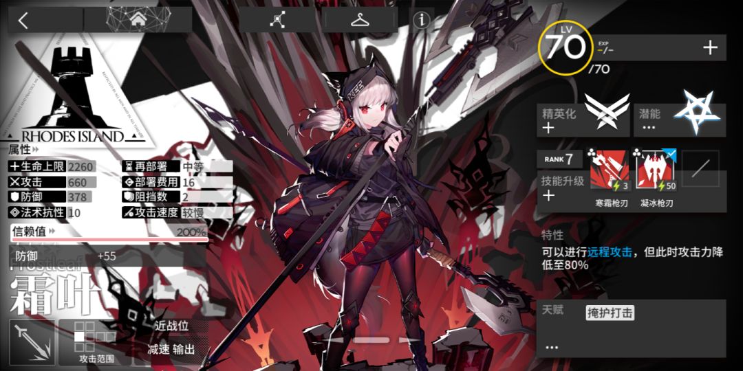 精二情况下,霜叶得到天赋---〖掩护打击〗。虽然它牺牲了一定的攻击间隔换取更大的攻击范围......(有点像白金对不对?)。