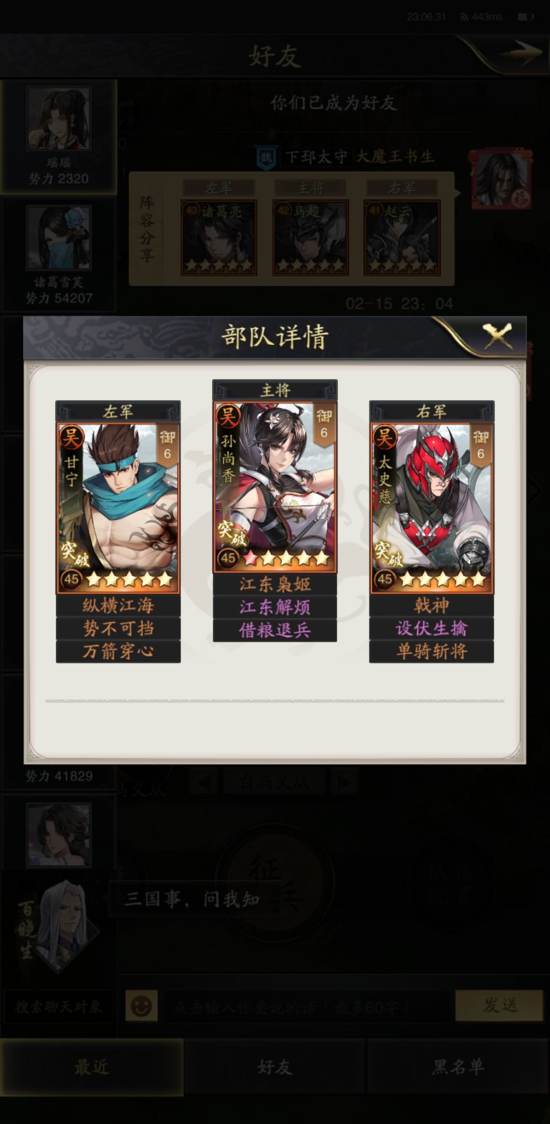 下面这个是我目前用的吴弓爆头队,当然 最好太史慈用任侠义气更好。大部分基本在会心时间 就打穿对面主将 屡试不爽哈哈哈