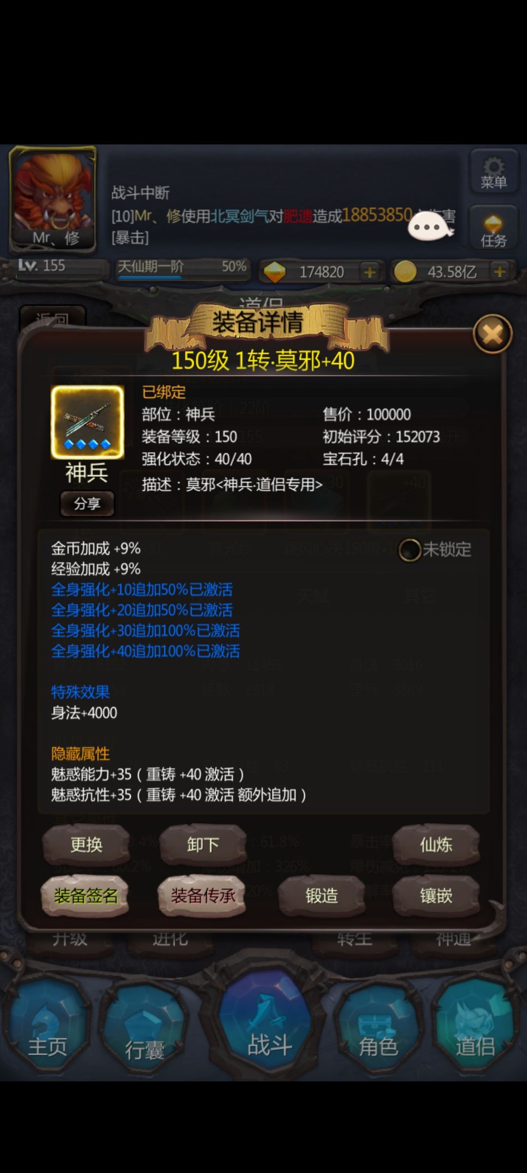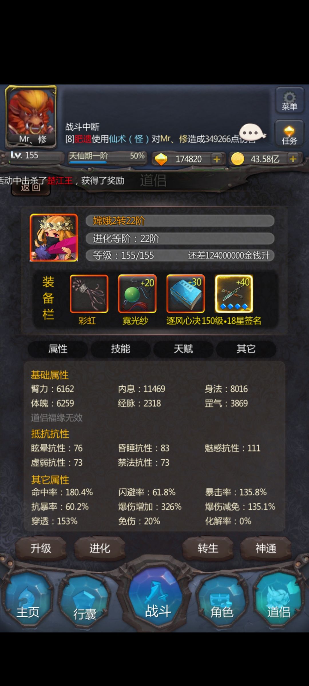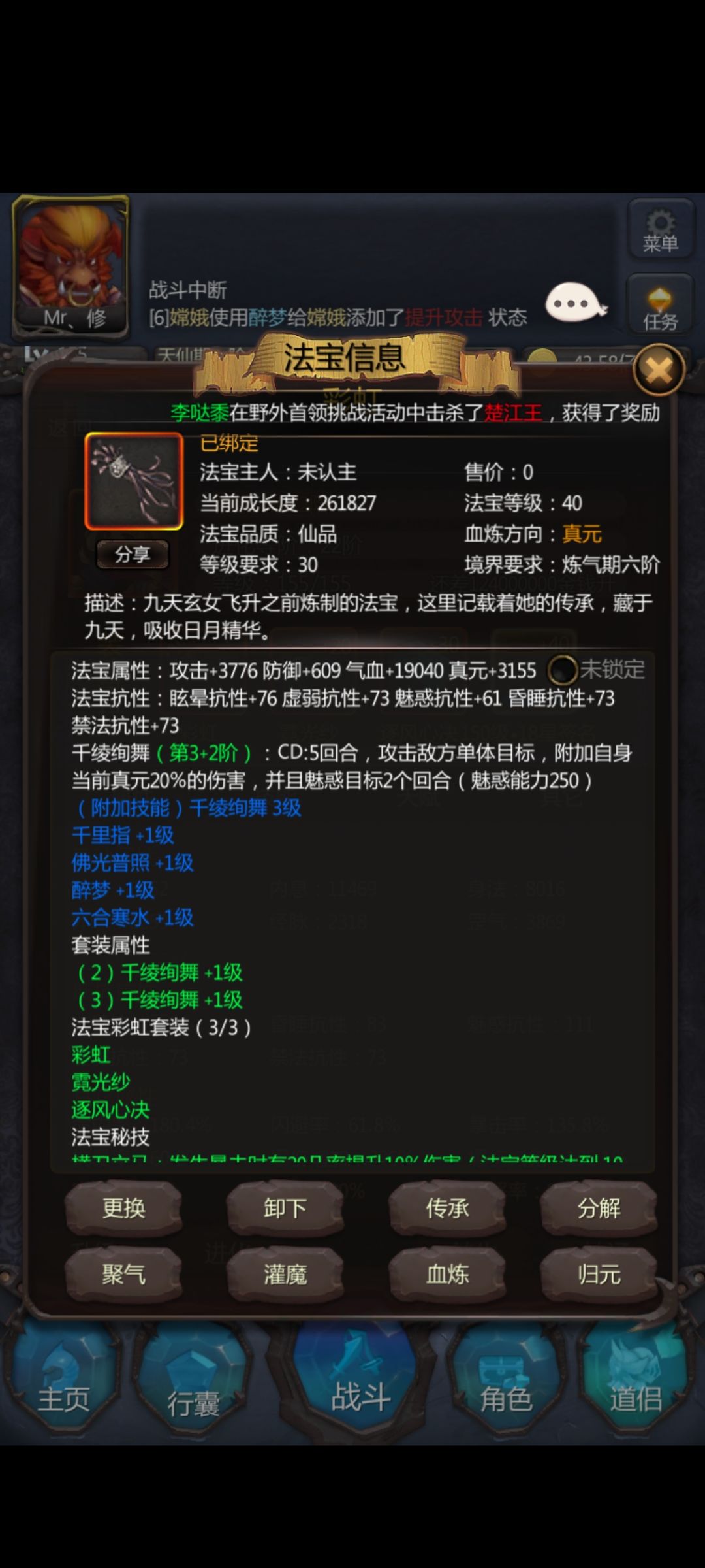 附带一个属性视频,神兵和法宝都有,因为没有野外次数,暂时无法录制打野视频,但是上面有昨天的战斗截图,也一样,不出意外的话应该是BUG!