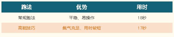 通过对比可以发现,高能技巧是在普通跑法的基础上增加了断漂补气和落地集气等操作,这些连续的高能技巧不但可以缩短跑图时间,在氮气上也更加具有优势。
