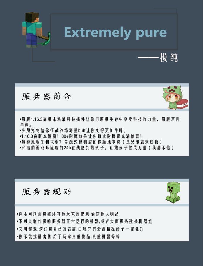 •你不可以恶意破坏其他玩家的建筑,偷窃他人物品•不可以制作影响服务器正常运行的机器,或者大面积搭建某机器组