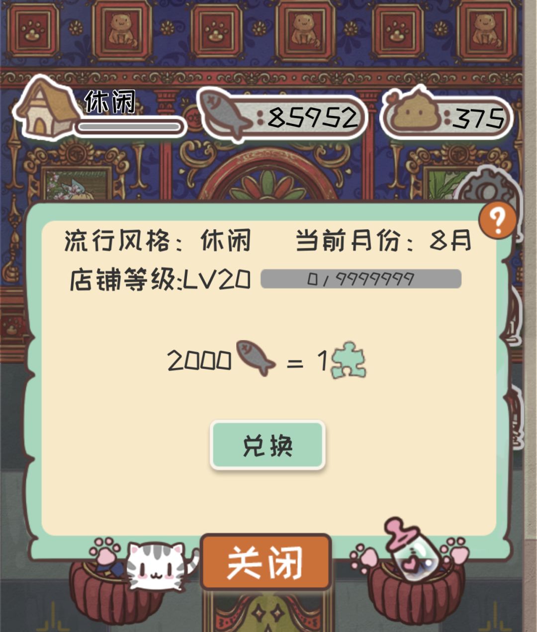 32只猫咪都10级了,店铺20级了,所有任务都做完了。