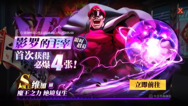 魔王降临,逆转绝境!《街霸:对决》S魔王维加限时招募活动正在火热进行中,2月11日05:00至2月18日05:00,大家参与限时招募,即有机会获得这位全新格斗家。招募期间,首次获得必爆4张!