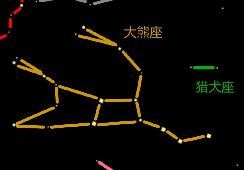 猎犬座只有两颗星,非常好找,看一下大熊座和猎犬座的具体位置: