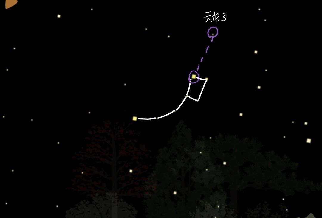 紫色部分圈出的星星沿着勺柄方向延伸的第一颗星是天龙座的第三颗星,如图: