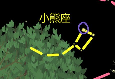 小熊座勺柄边缘的那颗星星(紫色)周围有三颗星星,如图: