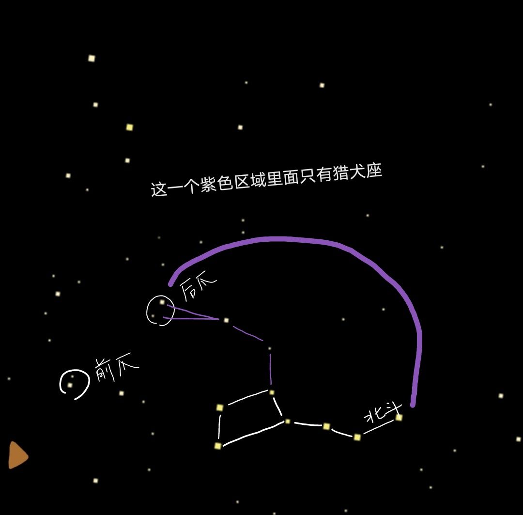 猎犬座就包在后腿和尾巴之间,而且除了猎犬座这之间没有其他星星,太让人省心了猎犬座- ̗̀(๑ᵔ⌔ᵔ๑)