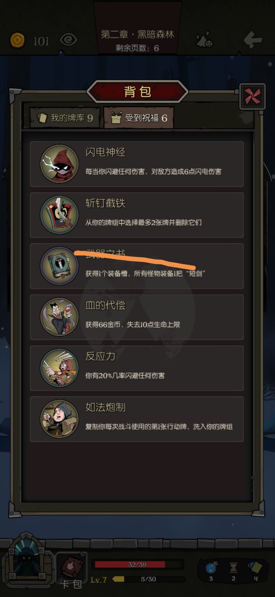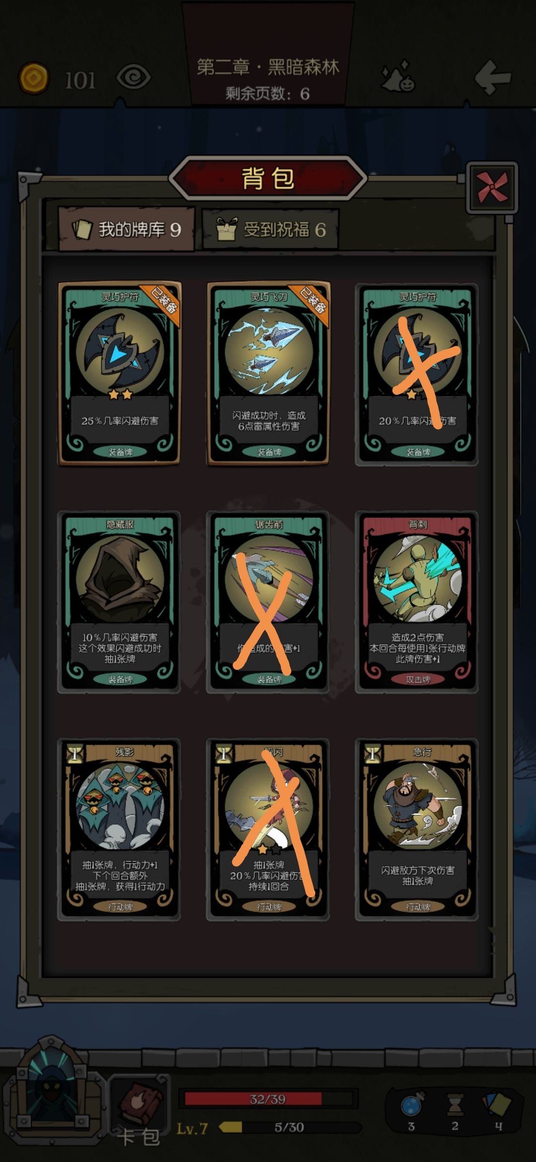 我带了下面这几张卡,发现闪避是100%的,无论对面攻击多少次。划掉的那些是后来的,没划掉的是之前的卡,这是什么原理