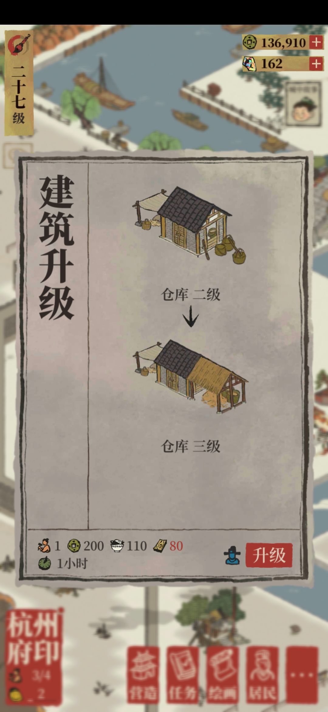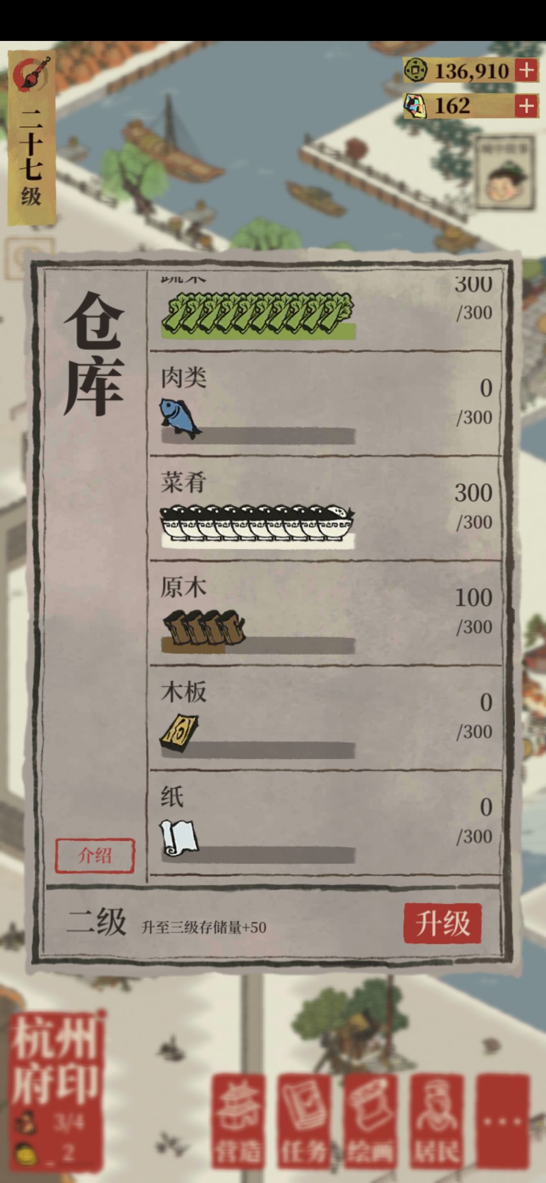 现在是这样的,各位同志们,由于我新开辟了杭州府,然后呢我还继续完成他的任务,,让我有新的竹林,但是我的仓库只能容纳300碗饭,要升级仓库,就需要木板,,要木板就要有竹林才能建,所以现在是个循环,我不知道该怎么办?竹子也是仓库容纳不下,也无法升级,无法建新de