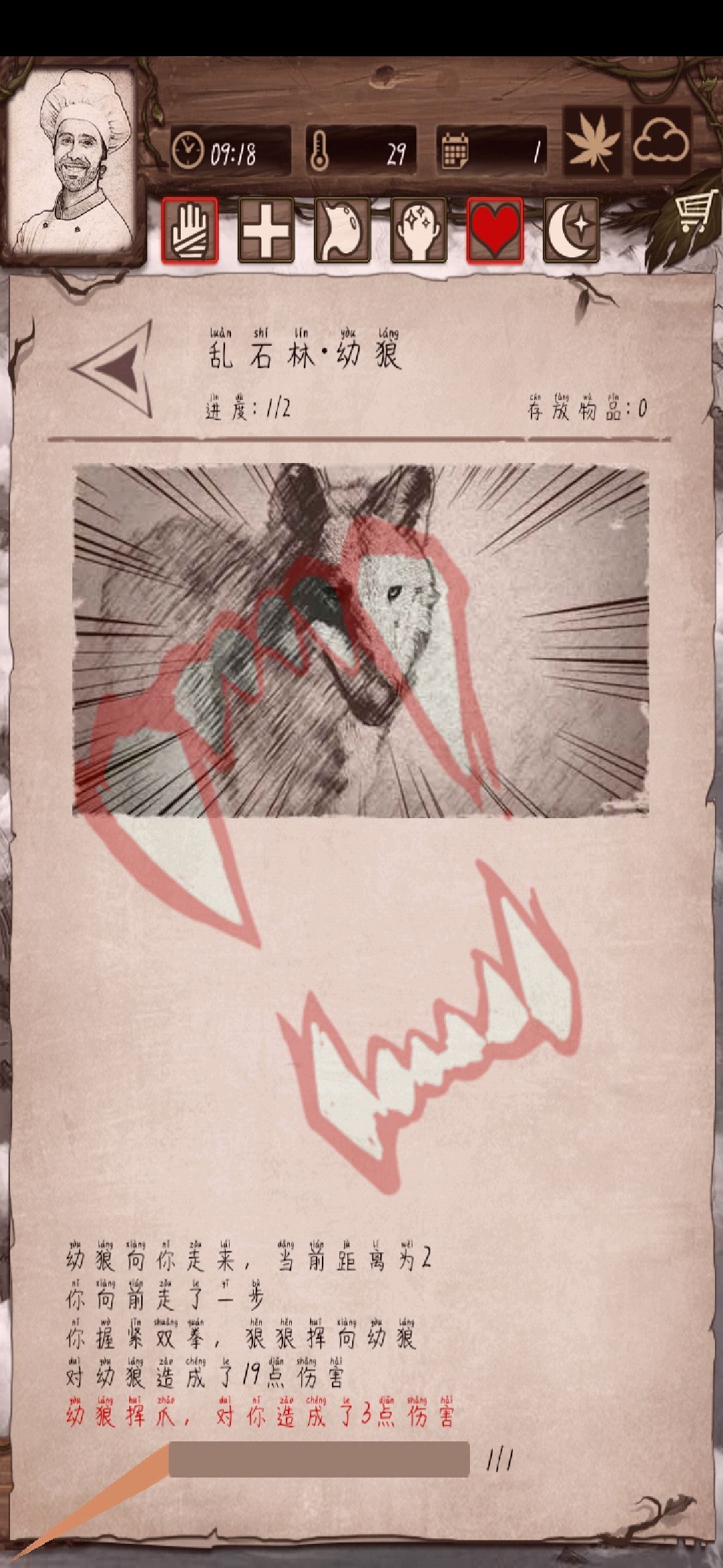 吃点东西睡觉,四小时即可,醒来外出前往竹林,通关竹林后再次点开竹林清理下野猪(野猪会妨碍竹子生长,竹子是重要材料,建议留12,两天收一次,并且野猪是主要的生肉来源之一),离开竹林后前往灌木丛,清空灌木丛收集资源,把没回收完毕的资源全部回收,在营地吃点东西解锁升级建筑,时间差不多天黑,直接睡觉到6点即可