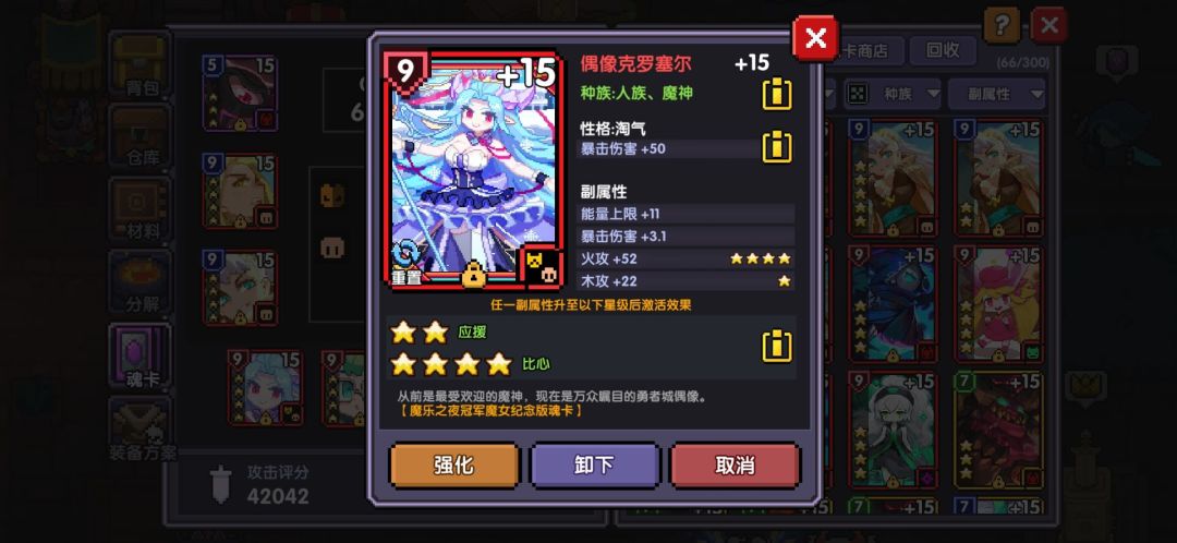 大多数人的第一张四星卡,星期四的魂卡奖励有产出。两星加百分之10暴击率,但是减25爆伤。四星效果是爆值一比一转换攻强。在偶像卡出现后加成显得不值一提了起来。没有偶像就带它