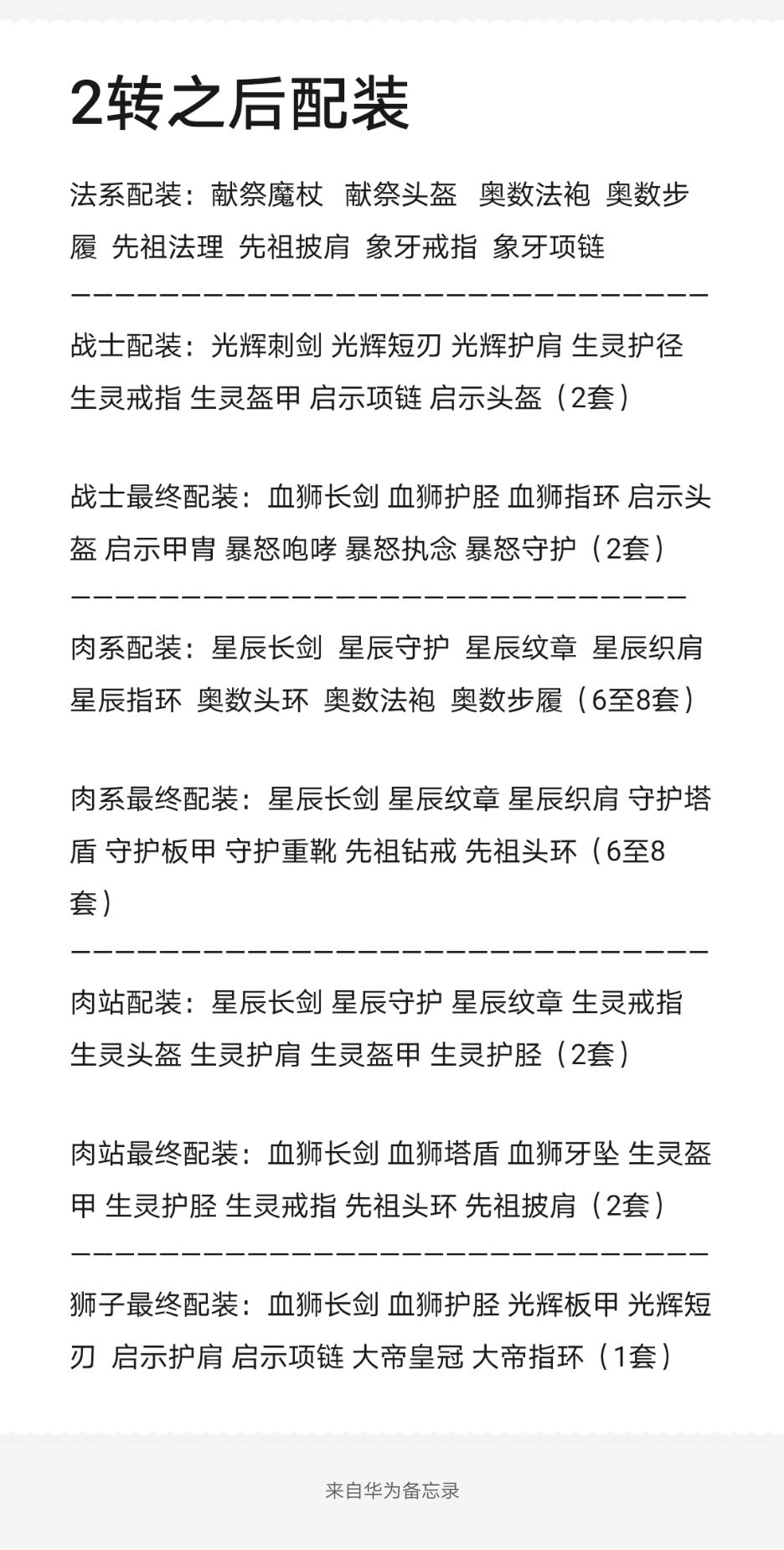 这是个人琢磨的2转及之后的过渡装和最终配装,因装备的力量体质等基础属性享受角色觉醒后的20%基础属性加成,所以配装时优先考虑套装的基础属性。有不足之处请多多指教。