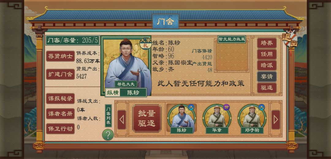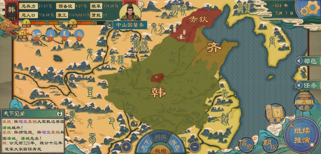 《第三步 》也是最关键的一步 ,以战养兵,免税压叛,迁都维稳 威压各国 这时候开始训练军队,将军队战力提高每只军队14000~20000人左右 没有兵就强征,这时候我们有本钱不要怕,在地图上优先找,到能够得到的存粮多的国家宣战后1月祭祀消除负面buff, 注意刚刚下城时的免税,够不到的国家可以利用威压,这样多一份收入,如果这时候没有称王,可以去请,或者自己僭越,可以先边训边打就是低战力的围城高战力训练好,为迎接主力军,中期以扩张为主,烧书为辅,我们必须以扩张获得粮食 , 来维持烧书带来的高骚乱的免税所造成的经济压力(大量城市骚乱严重免税肯定贤能不够直接迁都划算) , 基本到这个时候你就只会遇到一个问题,那就是贤能的问题,解决办法就是广招门客,不管你从哪里弄,反正是越多越好,属性烂不烂无所谓,为了防止他们逃跑,可以让他们去当大夫,让他们去读书实在用不了的先给他所监狱里当候补,防止你大夫去世门客去世不够用的时候,可以把它们再补上去,学宫也是要参与的,中期一定要自己自足多余的贤能可以进行自动建设,政策我一般是不点我这个思路是不需要政策的