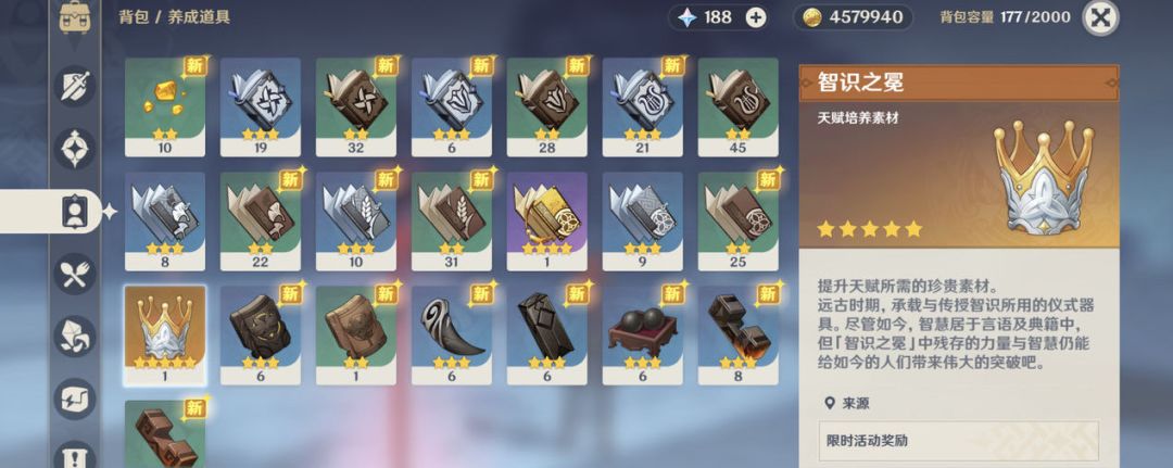 智识之冕是五级稀有度的材料,目前只能通过限时活动肝材料兑换获得,由于角色的战斗天赋等级到达10级是一个非常质的提升,因此智识之冕是培养角色的必备材料之一,鉴于该材料的稀有程度,目前只推荐将智识之冕用于主C角色的战斗天赋升级。