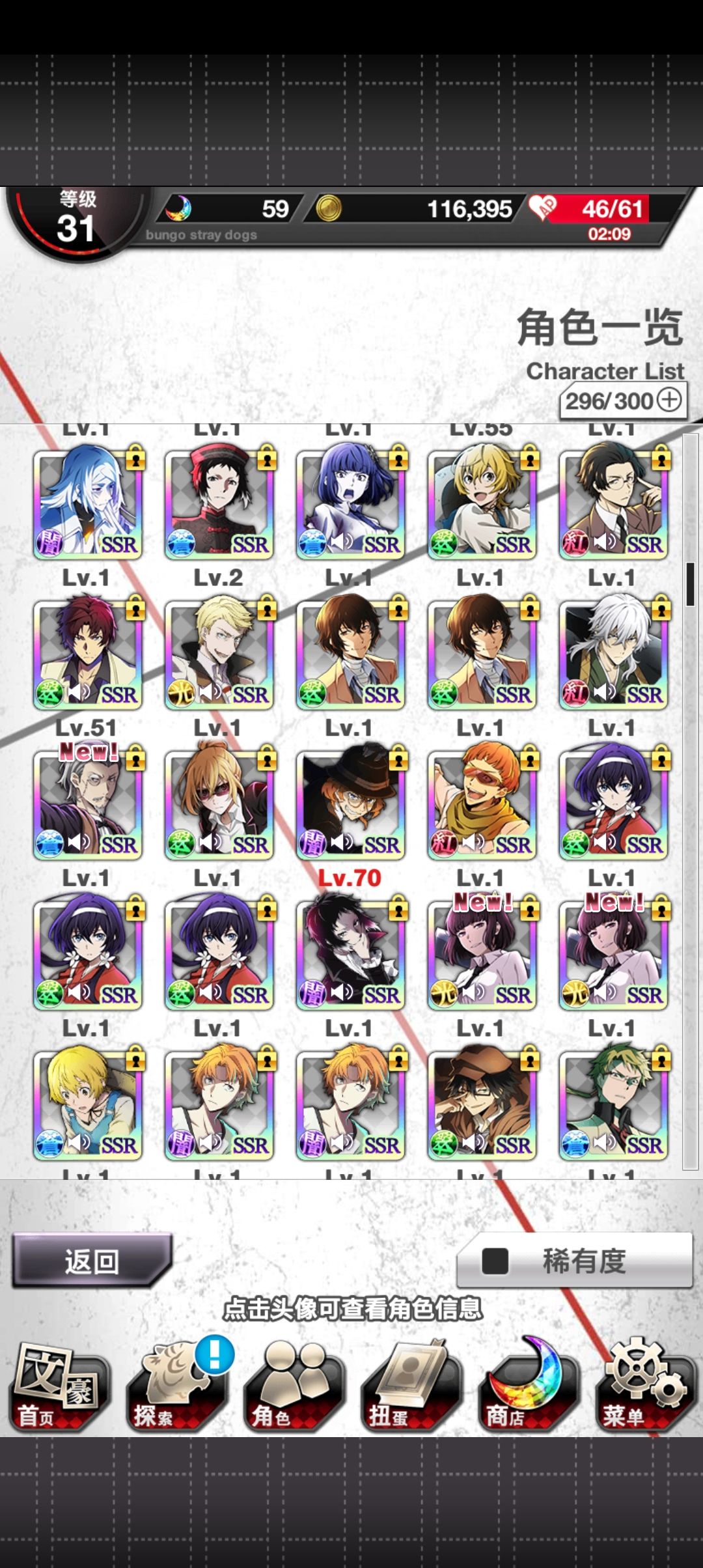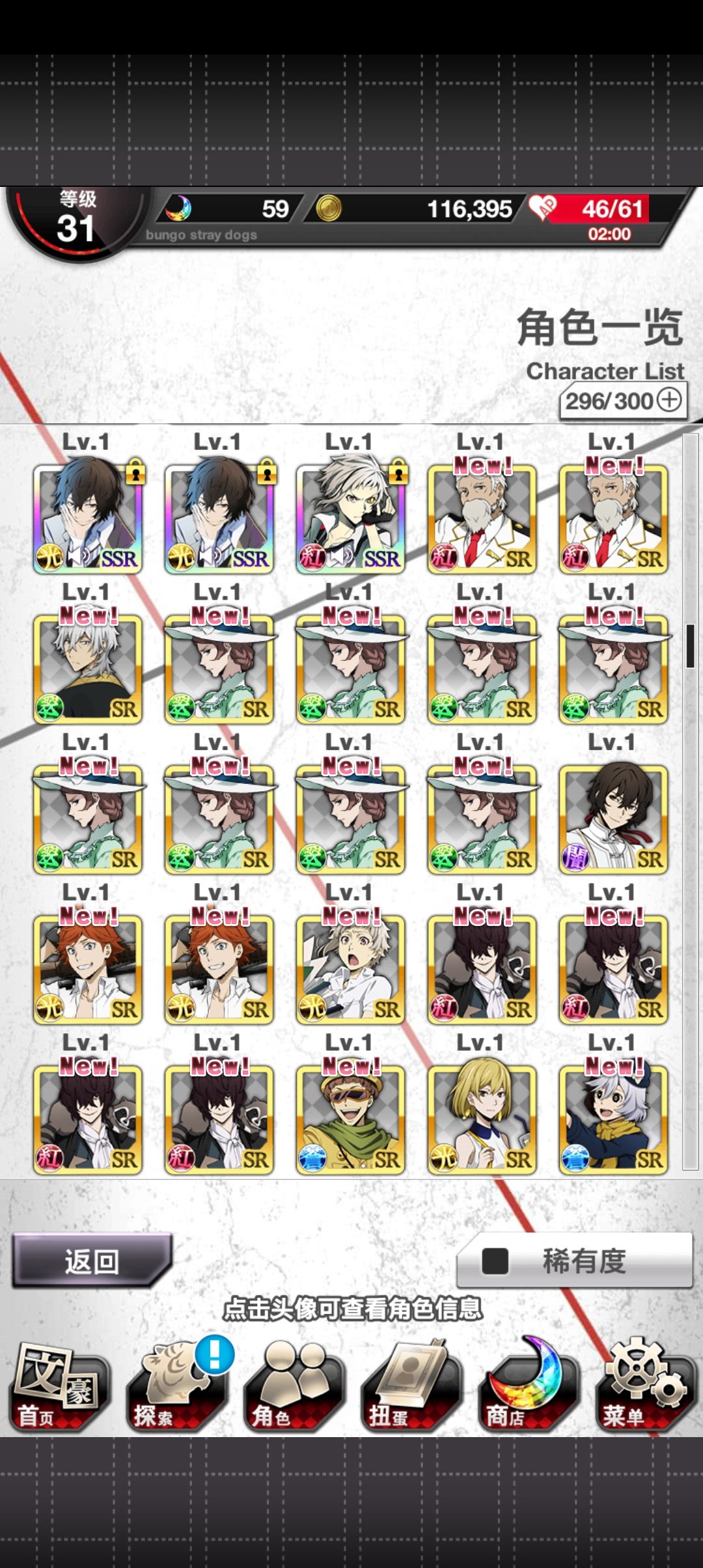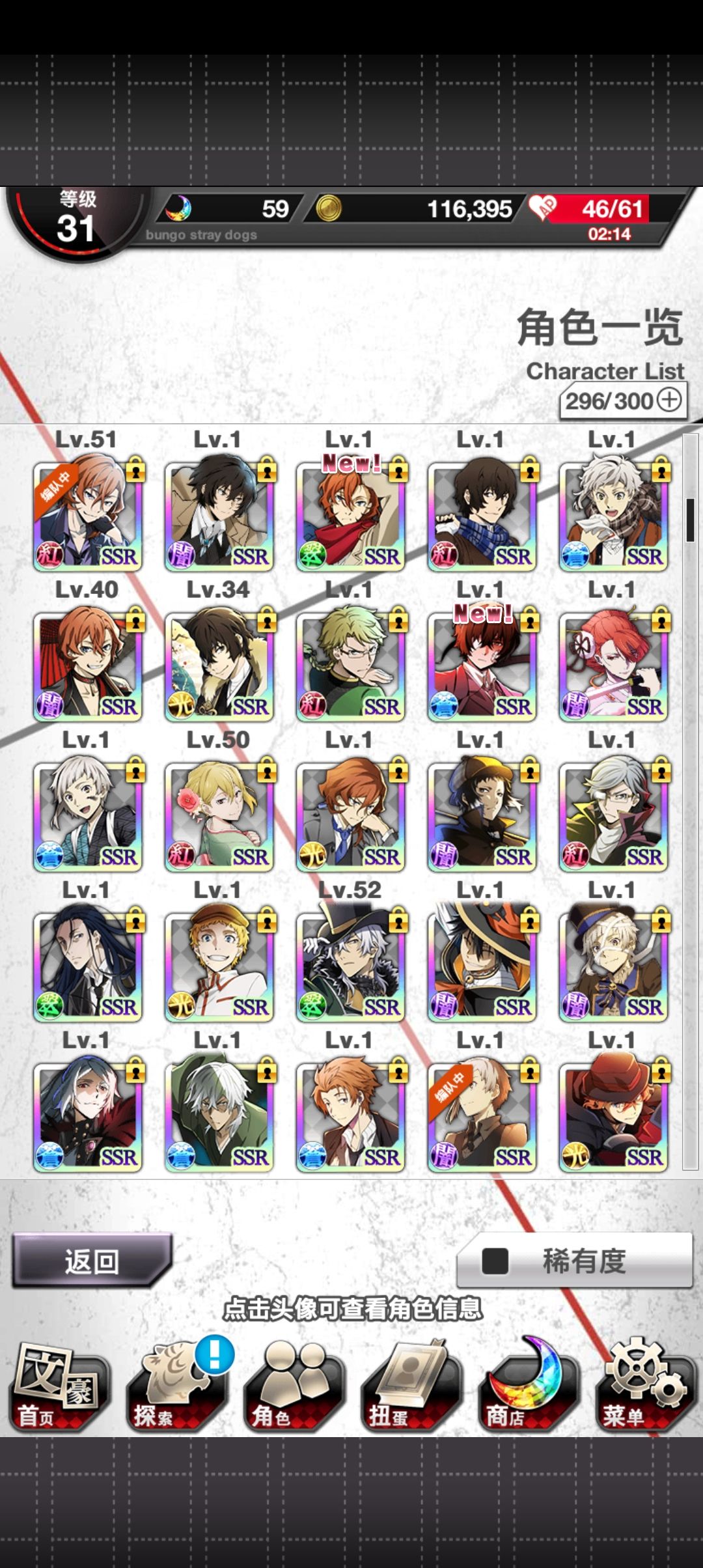 忘了啥时候回来的,一直很咸鱼,送石头就抽不送就算了,任务也不打活动也不打所以活动ssr几乎都没有wwww