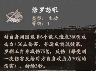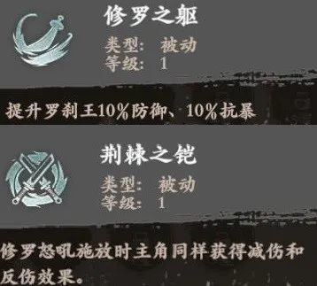 第二个技能则是对修罗怒吼主动技能的提升,它可以把修罗怒吼附带的反伤减伤效果同时附加到玩家角色身上,当然这是没有嘲讽效果的附加,不然罗刹王的修罗怒吼就没有意义了。